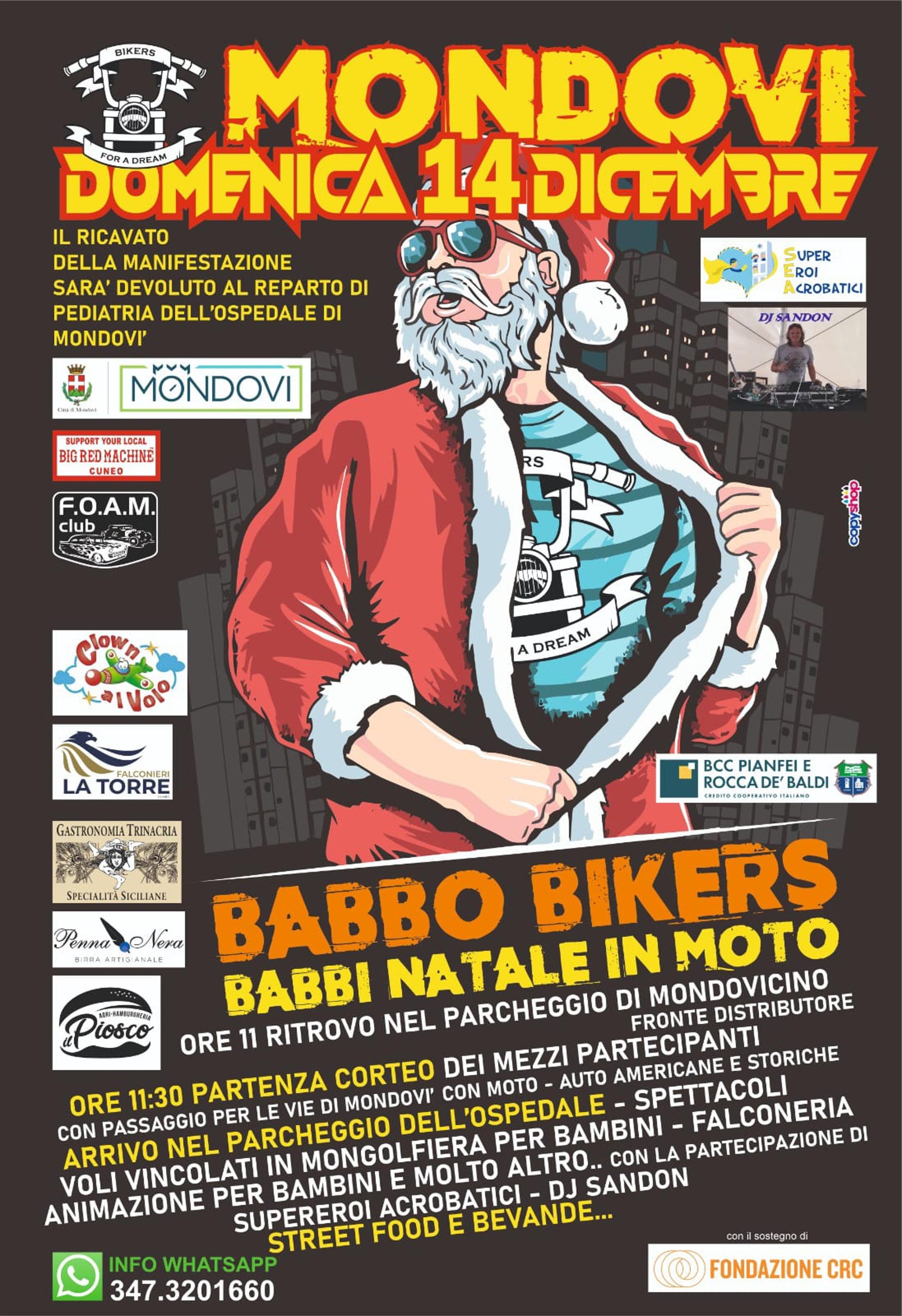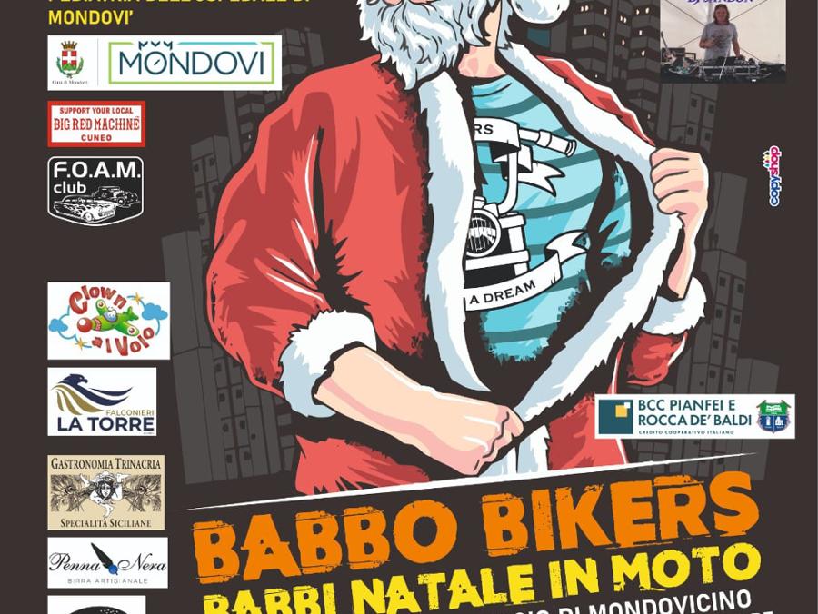Domenica 14 dicembre dalle 11.30 a Mondovì avrà luogo la Babbo Bikers, una manifestazione all'insegna della beneficenza, giunta alla quinta edizione. La manifestazione inizierà con il ritrovo di tutti i mezzi (moto, auto americane e d'epoca, maggiolini) nel parcheggio del centro commerciale Mondovicino alle ore 11.00, con partenza alle 11.30 alla volta dell'ospedale Regina Montis Regalis, con varie attrazioni quali: supereroi acrobatici, falconeria, una mongolfiera che farà fare voli vincolati ai bambini, animazione per bambini. Saranno presenti, inoltre, street food e bevande. Tutte le donazioni ricevute e i giocattoli saranno donati al reparto pediatria.