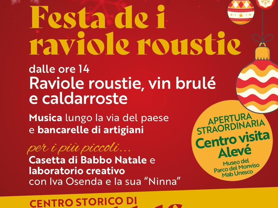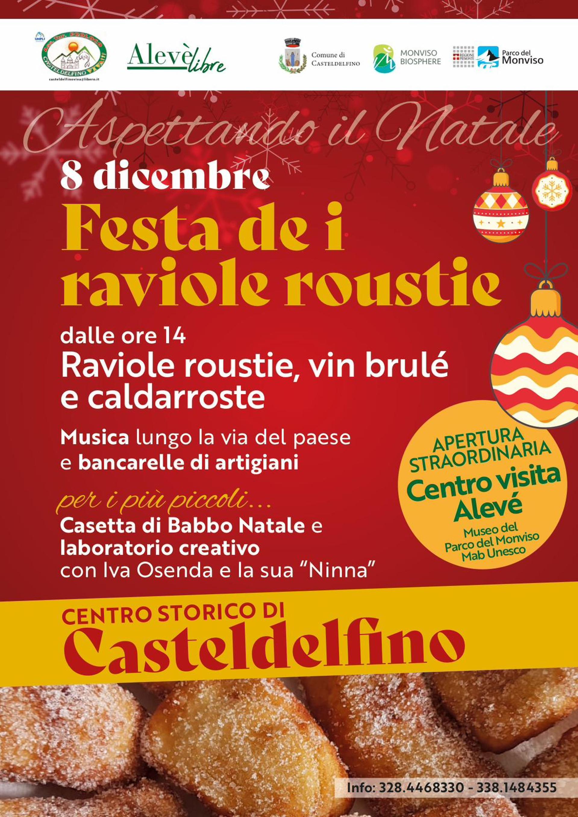 Lunedì 8 dicembre il centro storico di Casteldelfino ospita la "Festa de i raviole roustie". Dalle ore 14.00, raviole roustie, vin brulé e caldarroste, tutto accompagnato da musica lungo la via del paese e dalle bancarelle degli artigiani. Ad attendere i più piccoli, la casetta di Babbo Natale e un laboratorio creativo. Con l'occasione, apertura straordinaria del Centro visita Alevé, Museo del Parco del Monviso Mab Unesco.