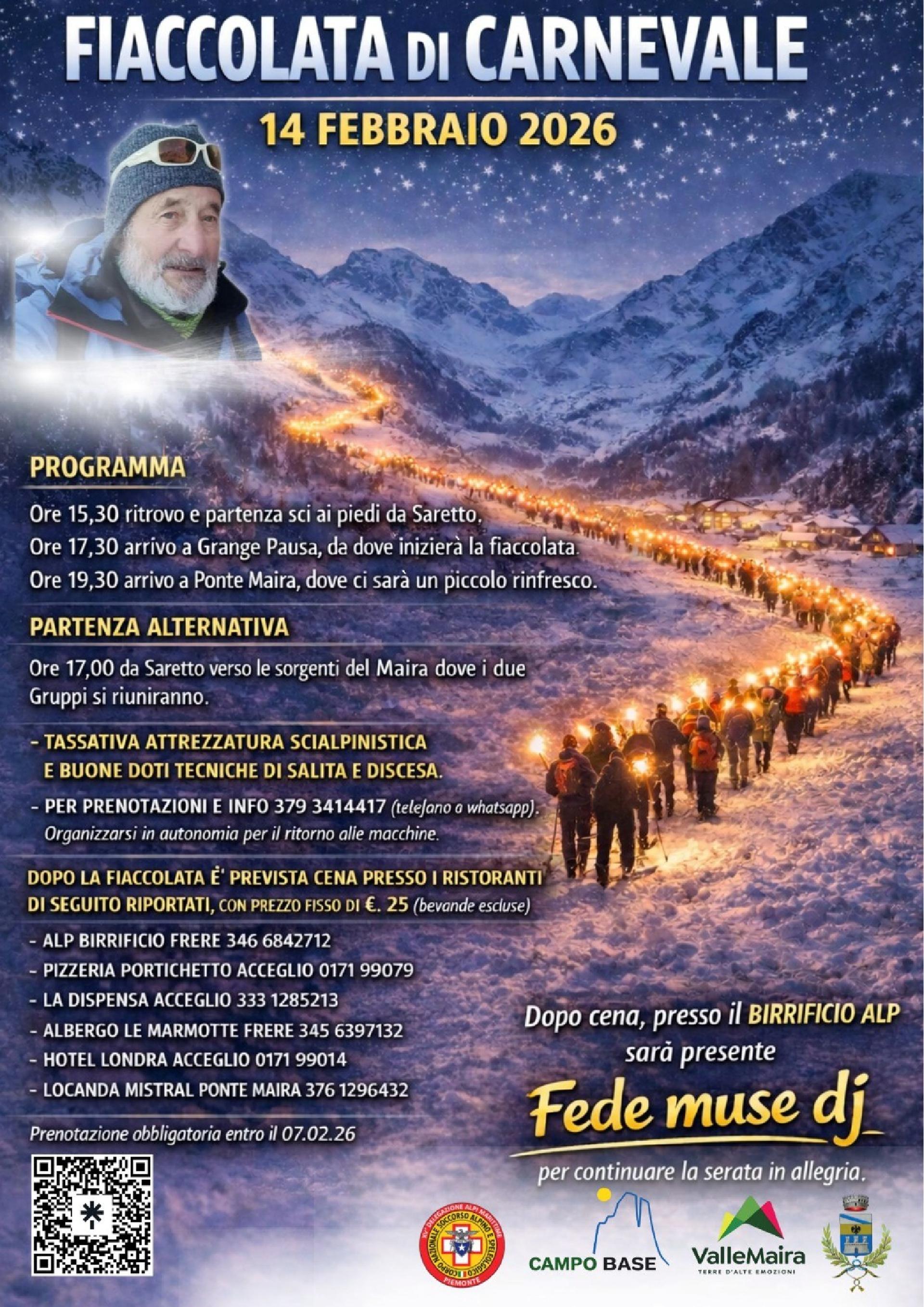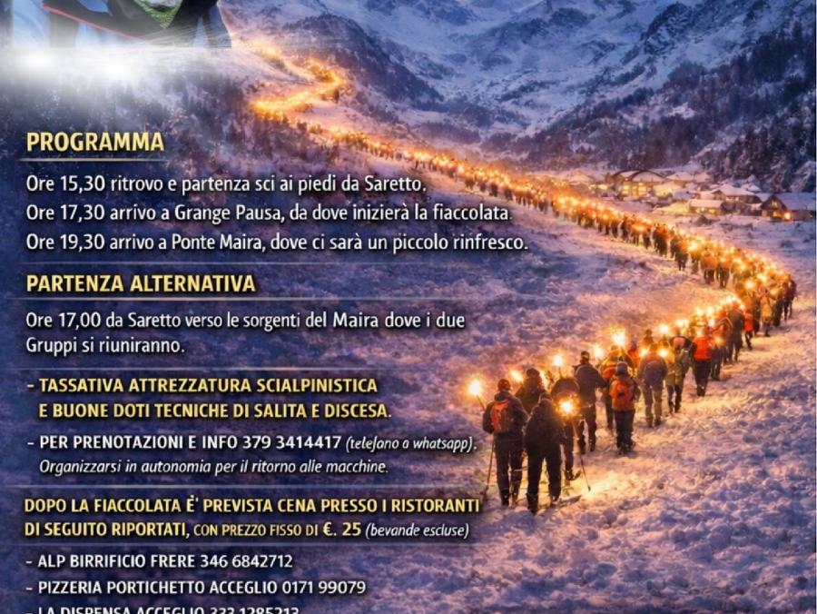 Sabato 14 febbraio, dalle ore 15.30, il Comune di Acceglio organizza una suggestiva fiaccolata notturna in occasione del Carnevale. Un'esperienza unica tra montagna, luce e convivialità, aperta agli appassionati di sci alpinismo e agli amanti dell'atmosfera invernale.