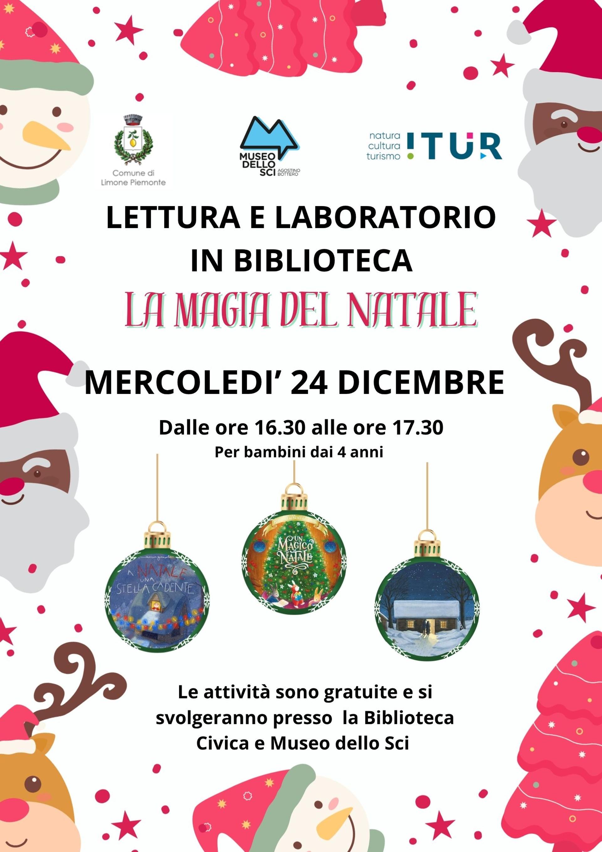Mercoledì 24 dicembre presso la Biblioteca e Museo dello Sci di Limone Piemonte, attività per bambini dai 4 anni dal titolo " La magia del Natale ", dalle ore 16.30 alle 17.30. Ingresso libero.
