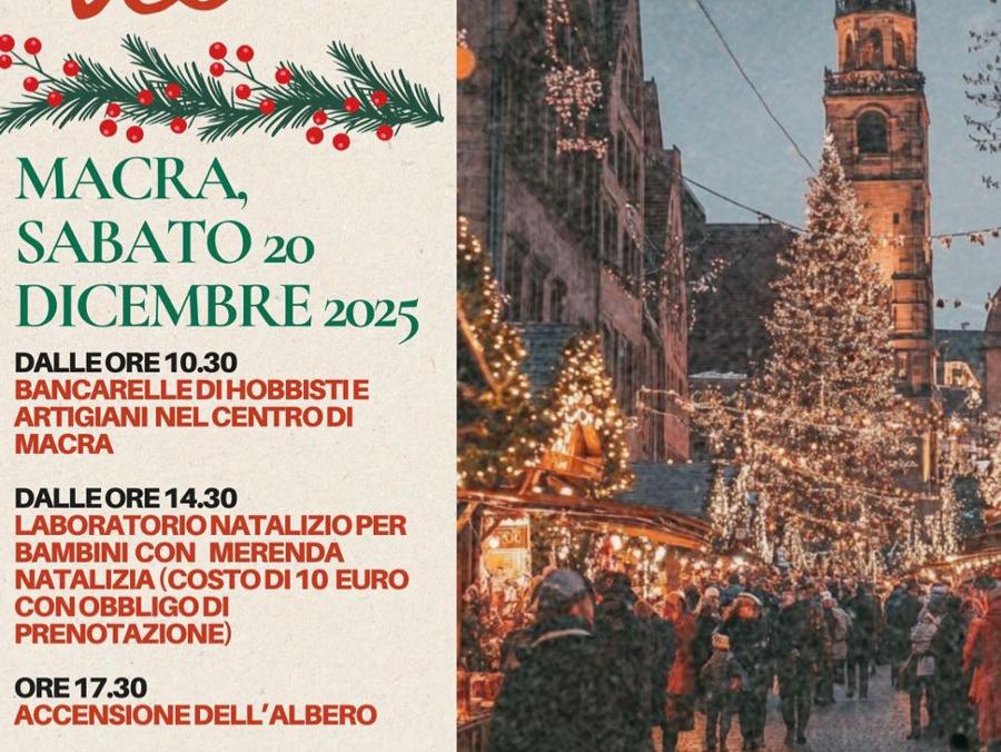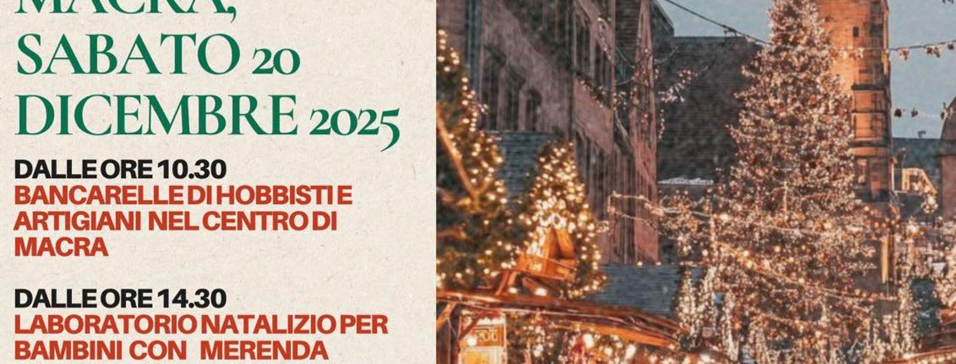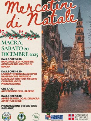 A Macra sabato 20 dicembre il paese si colorerà di luci, profumi e sorrisi con i mercatini di Natale. Le bancarelle degli hobbisti e degli artigiani del territorio saranno presenti già dal mattino; nel pomeriggio, invece, i più piccoli potranno divertirsi con un laboratorio creativo a tema e una dolce merenda natalizia (prenotazione obbligatoria). Al calare della sera accensione dell'albero di Natale.