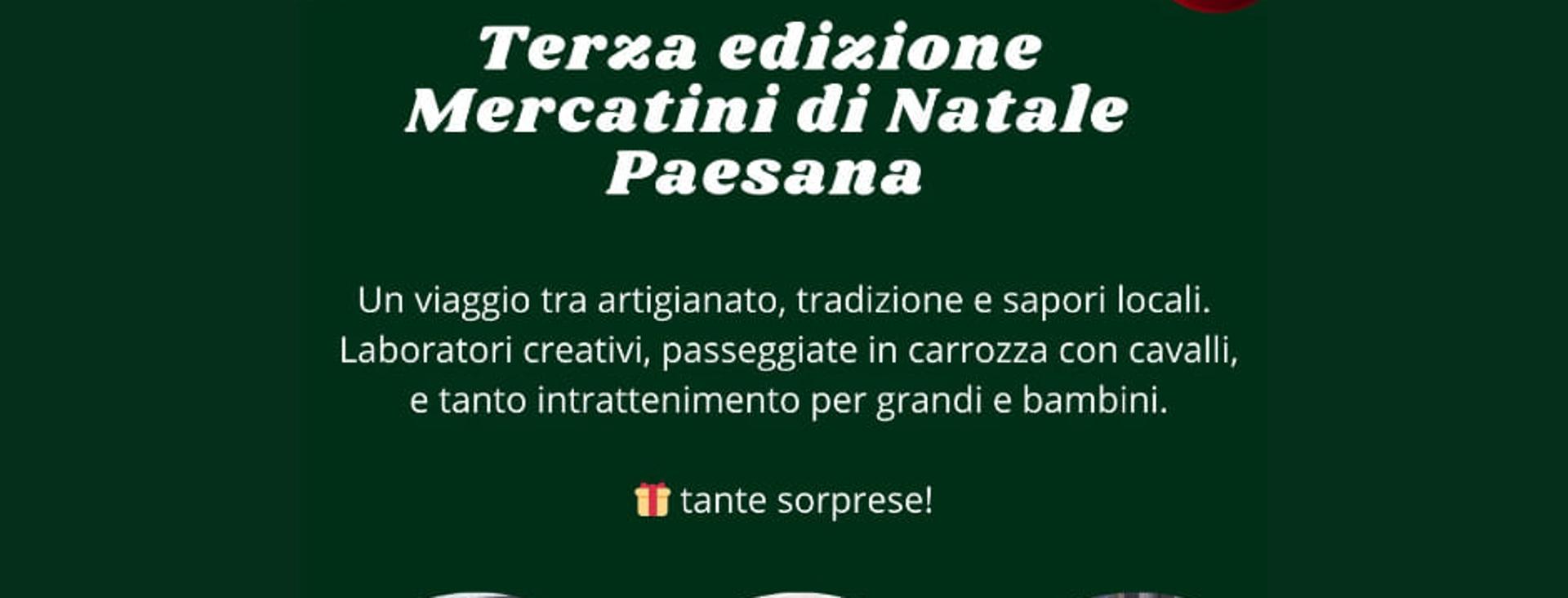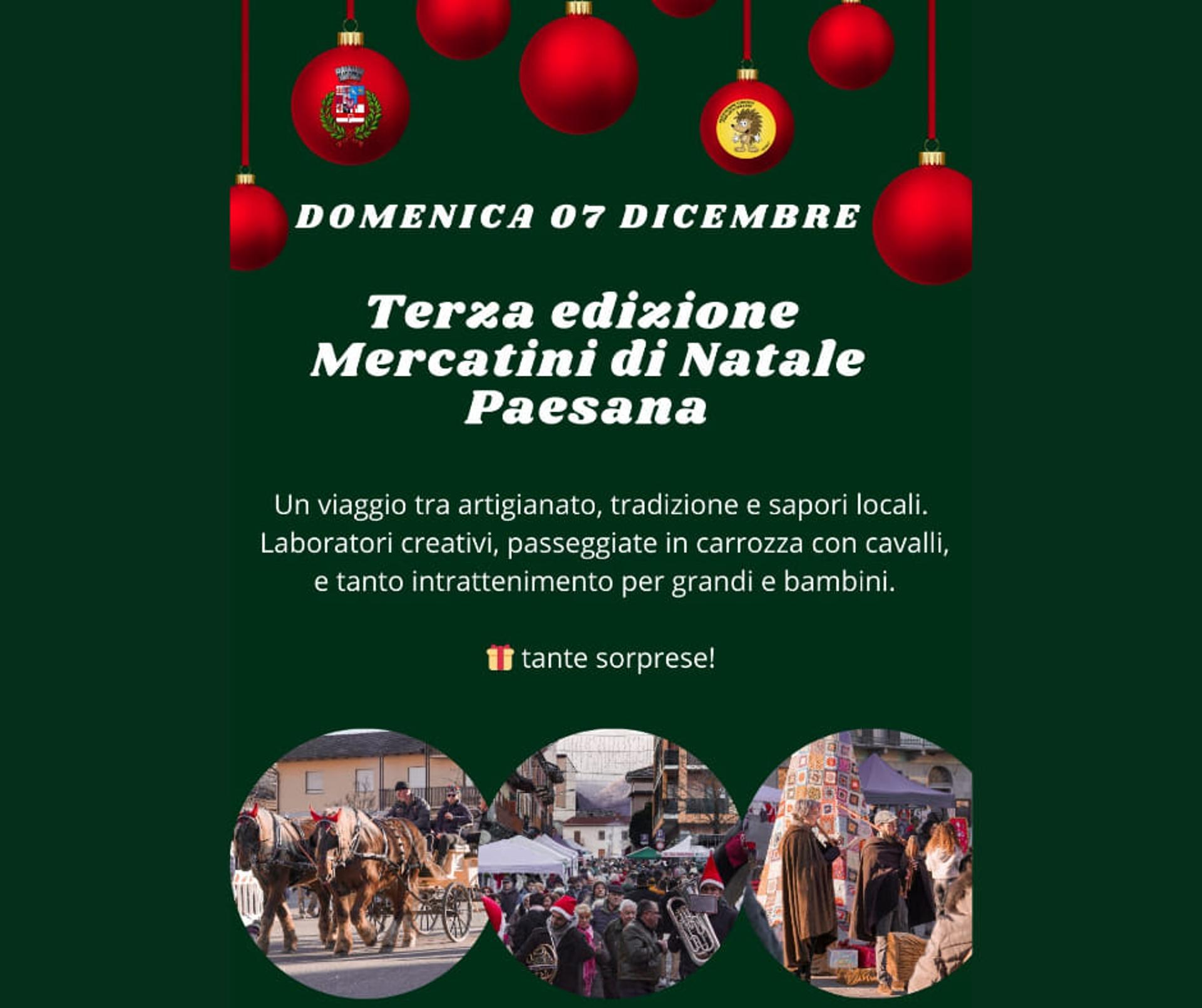 Il 7 Dicembre 2025 si terrà la Terza edizione dei Mercatini di Natale di Paesana esplorando la tradizione, i sapori locali, l'artigianato, passeggiate in carrozza e cavalli, laboratori creativi e intrattenimento per tutte le età.