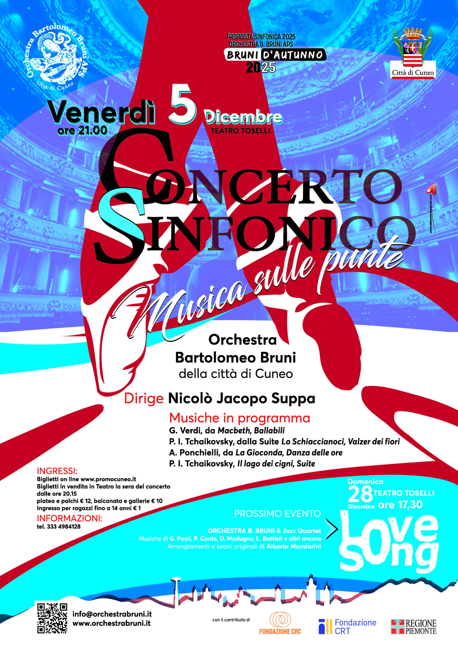 Venerdì 5 dicembre alle ore 21 presso il Teatro Toselli di Cuneo, ritornano gli appuntamenti con la grande musica sinfonica a cura dell’Orchestra “Bartolomeo Bruni”. Sul podio il M.° Nicolò Jacopo Suppa che, insieme all’orchestra cuneese, accompagnerà il pubblico in un emozionante viaggio fra le note, di autori romantici, pensate per balletti. I biglietti saranno acquistabili in teatro la sera stessa del concerto oppure in prevendita sul sito.