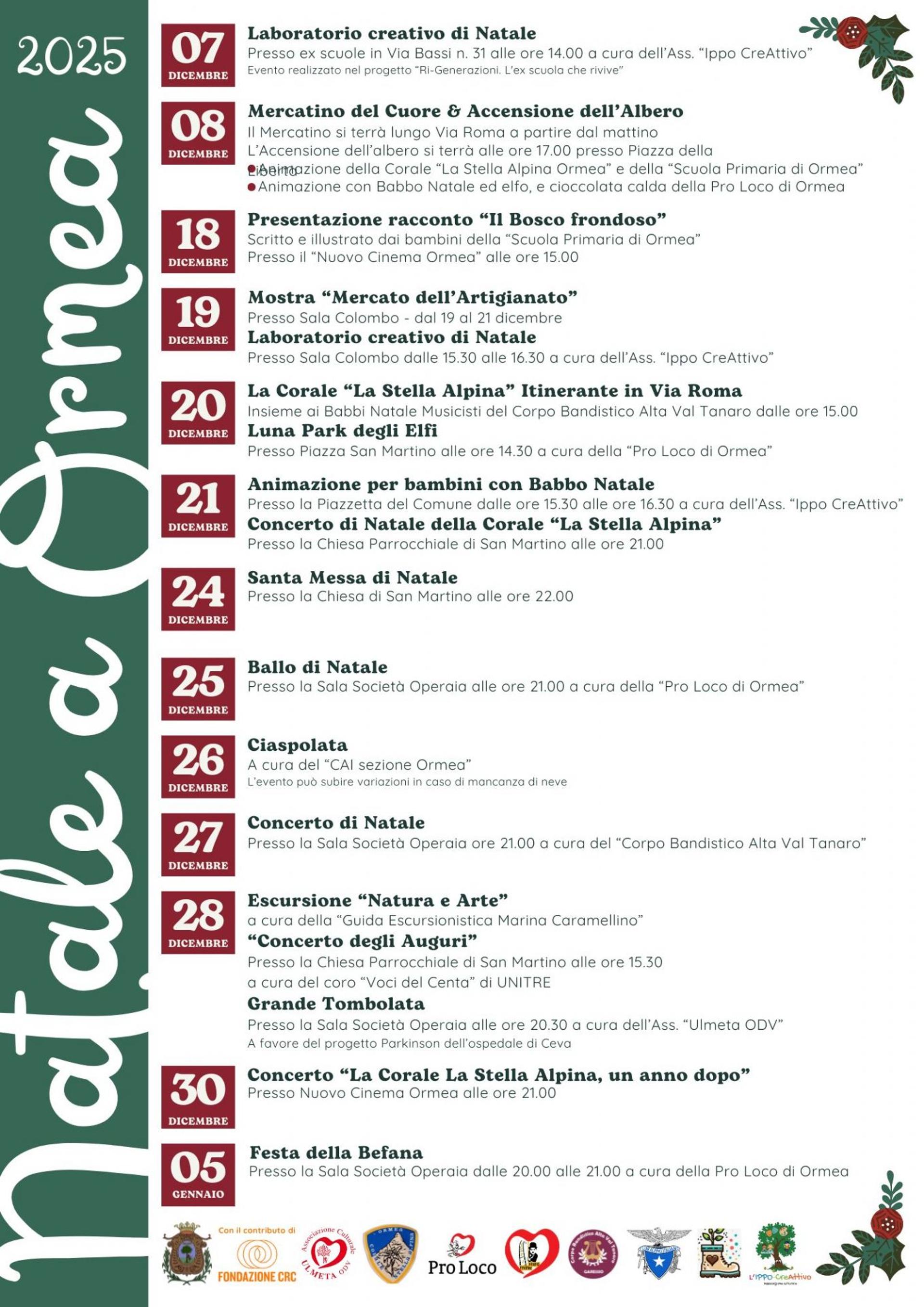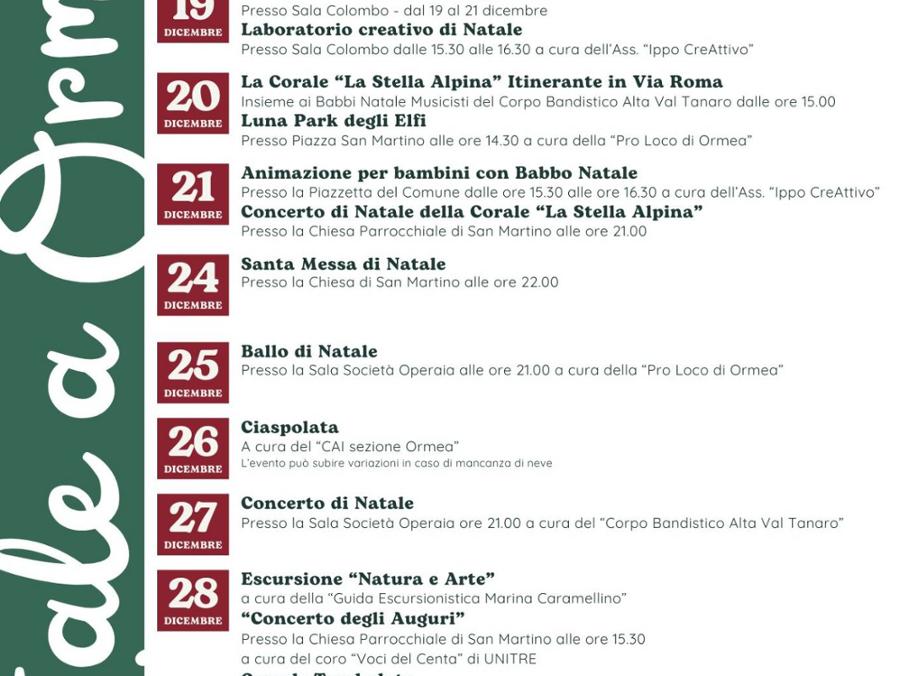 Con l’iniziativa “Natale a Ormea 2025”, il territorio si prepara a vivere un ricco calendario di appuntamenti che, dal mese di dicembre all’inizio del nuovo anno, accompagneranno cittadini e visitatori in un percorso fatto di atmosfere luminose, musica, tradizioni e momenti di autentica condivisione.