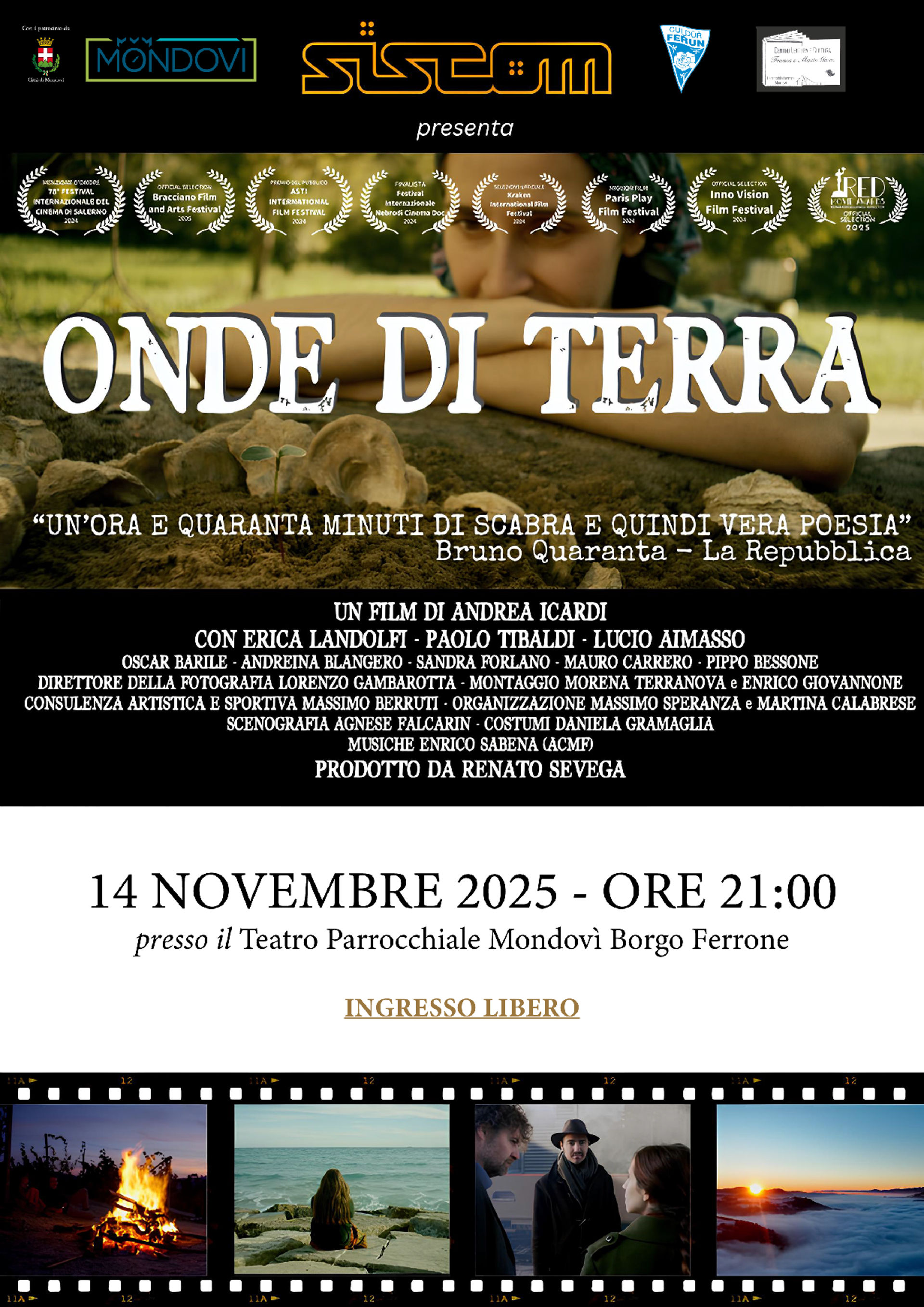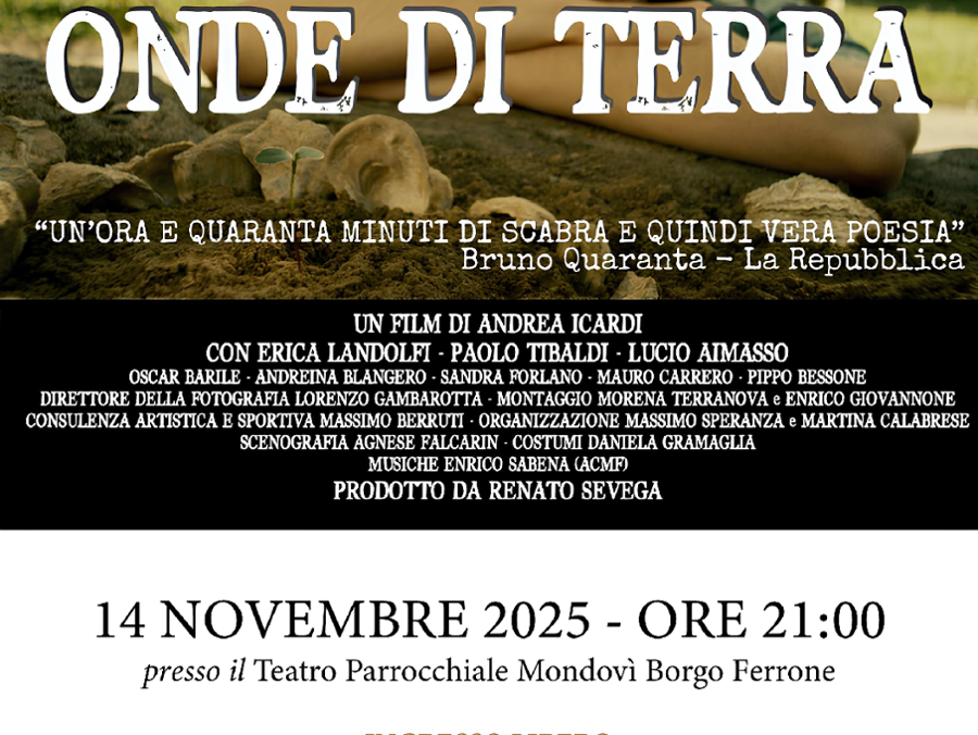 Il prossimo 14 novembre 2025 alle ore 21 ci sarà la proiezione del film “ONDE DI TERRA” del regista Andrea Icardi presso il Teatro della Parrocchia di Santa Maria Maggiore a Mondovì Borgo Ferrone. L’iniziativa è organizzata dalla Proloco Cui Dur Ferun e dalla Biblioteca Parrocchiale “Franca e Mario Gasco” e la rassegna proseguirà nei primi mesi del 2026 con altri due film entrambi a firma del regista doglianese Remo Schellino.