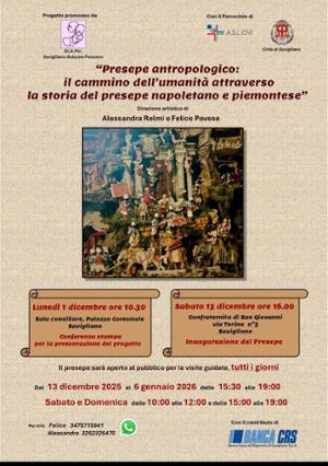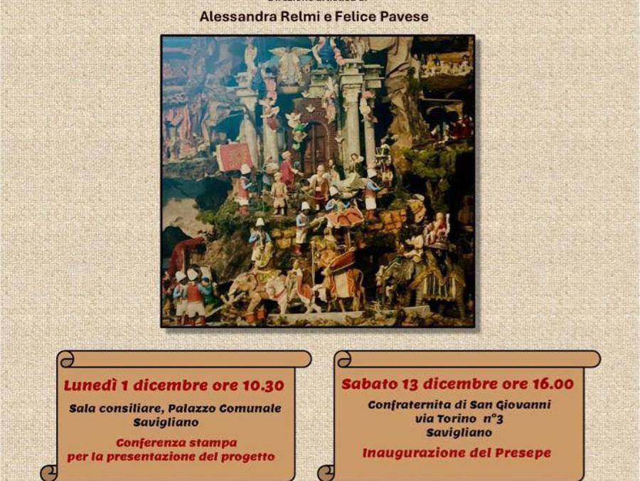 Da sabato 13 dicembre a martedì 6 gennaio, presso la Confratenita di San Giovanni a Savigliano, "Presepe antropologico: il cammino dell'umanità attraverso la storia del presepe napoletano e piemontese". Direzione artistica di Alessandra Relmi e Felice Pavese. Aperto dal lunedì al venerdì: 15.30 - 19; sabato e domenica: 10 - 12 e 15.30 - 19. Ingresso libero.