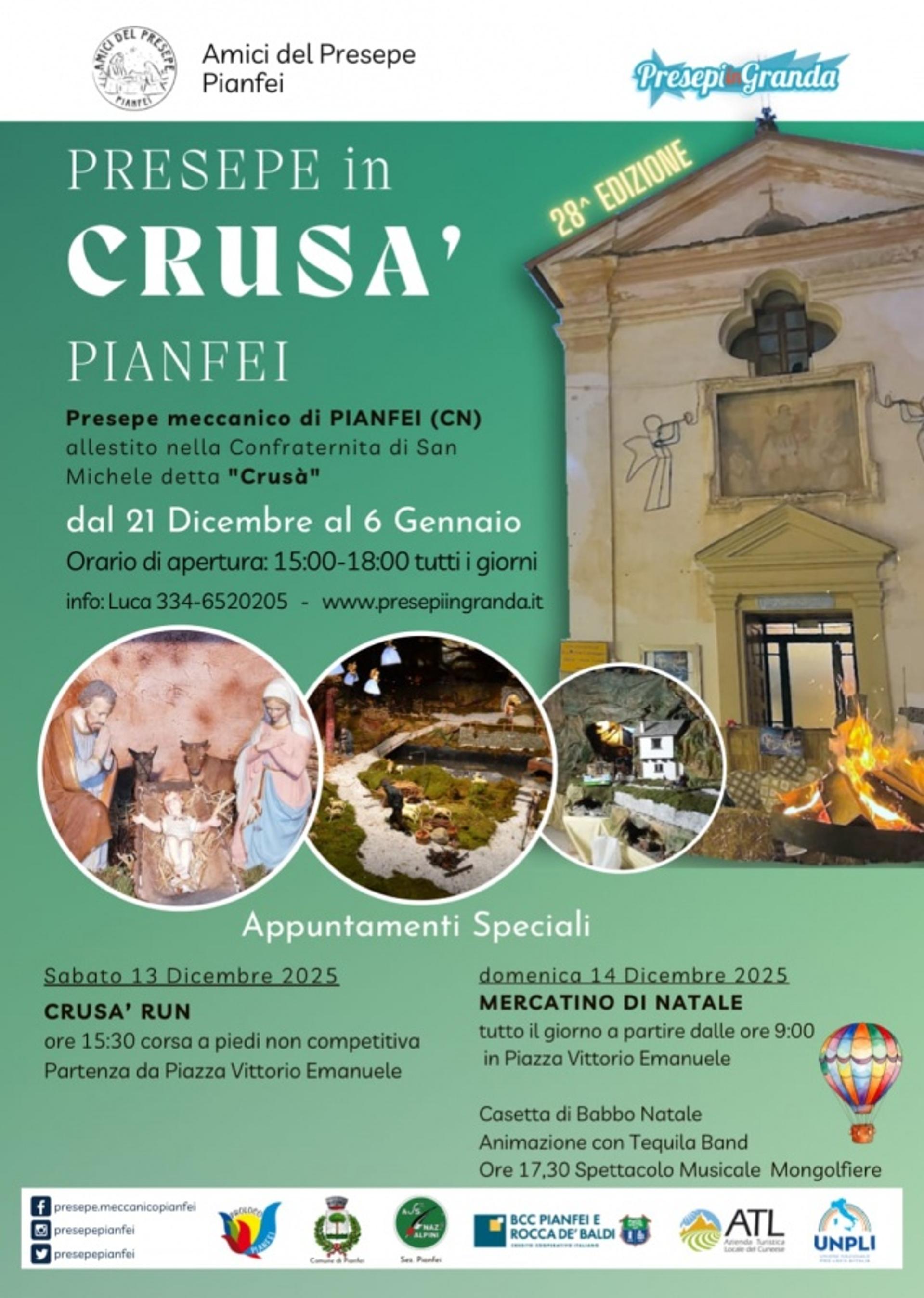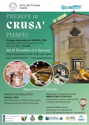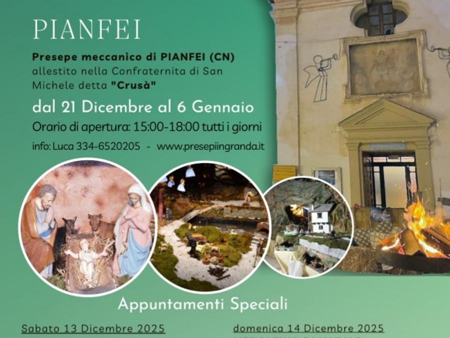 Da sabato 21 dicembre a martedì 6 gennaio, presso la confraternita di San Michele Arcangelo di Pianfei, detta Crusà, torna il tradizionale Presepe Meccanico organizzato dagli Amici del Presepe, allestito in circa 100 mq di superficie e con uno sviluppo in altezza di oltre 6 m. Aperto tutti i giorni dalle ore 15.00 alle ore 18.00, è un vero e proprio percorso attraverso grotte, paesaggi, montagne, cascate che portano alla grotta della natività, con la possibilità di camminare all'interno di un paesaggio magico.