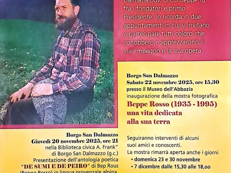 Ricorrendo trent'anni dalla scomparsa del prof. Beppe Rosso l'Associazione Pedo Dalmatia odv, di cui Beppe fu fra i fondatori e primo Presidente, lo ricorda con una mostra a Borgo San Dalmazzo, presso il Museo dell’Abbazia: “Beppe Rosso (1935 – 1995) una vita dedicata alla sua terra”. La mostra sarà aperta dalle 15.30 alle 18 di domenica 7 dicembre.