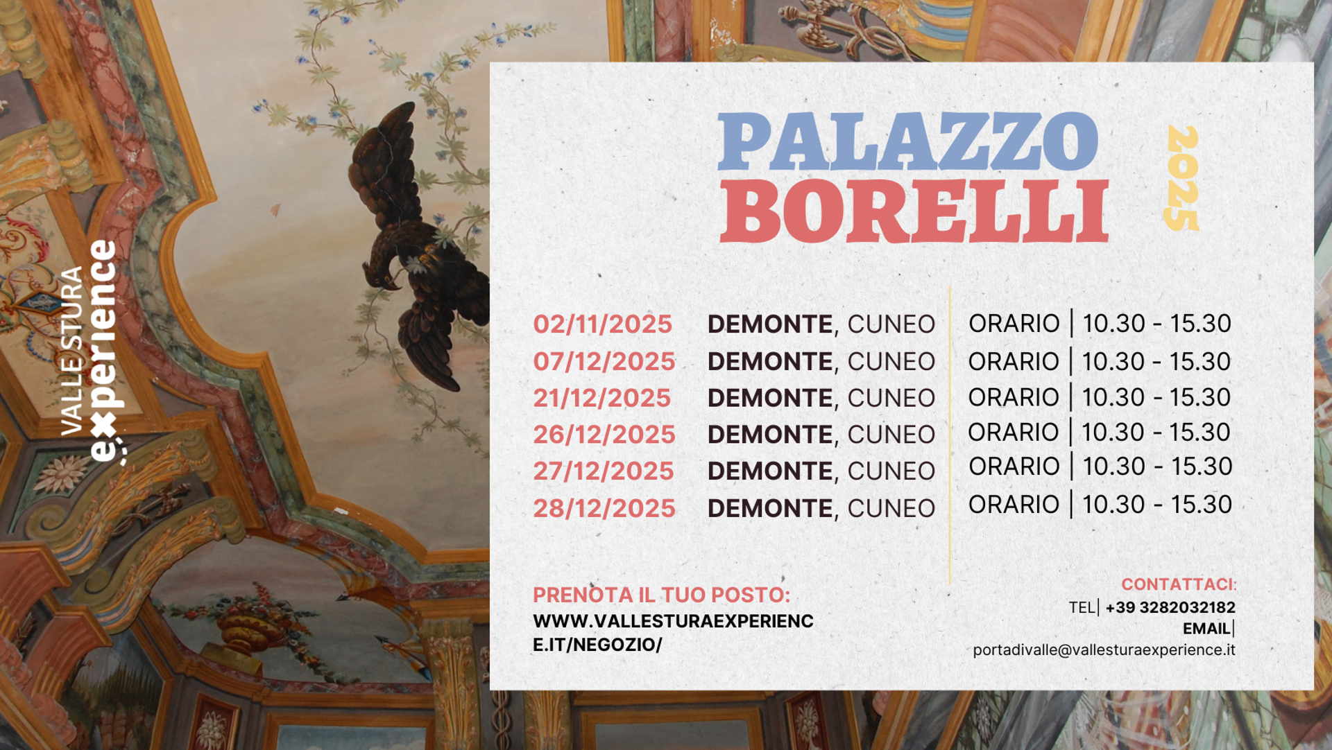 Da domenica 2 novembre a domenica 28 dicembre, dalle ore 10,30 alle 15,30 a Demonte, Valle Stura Experience organizza sei visite guidate a Palazzo Borelli. Evento a pagamento, prenotazione necessaria.