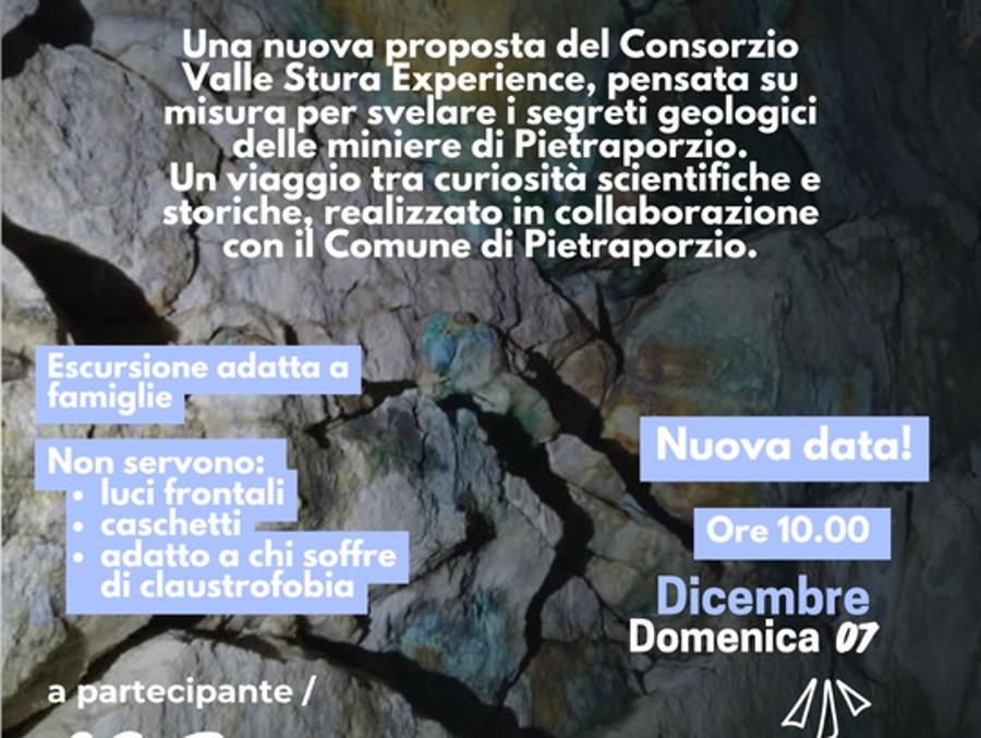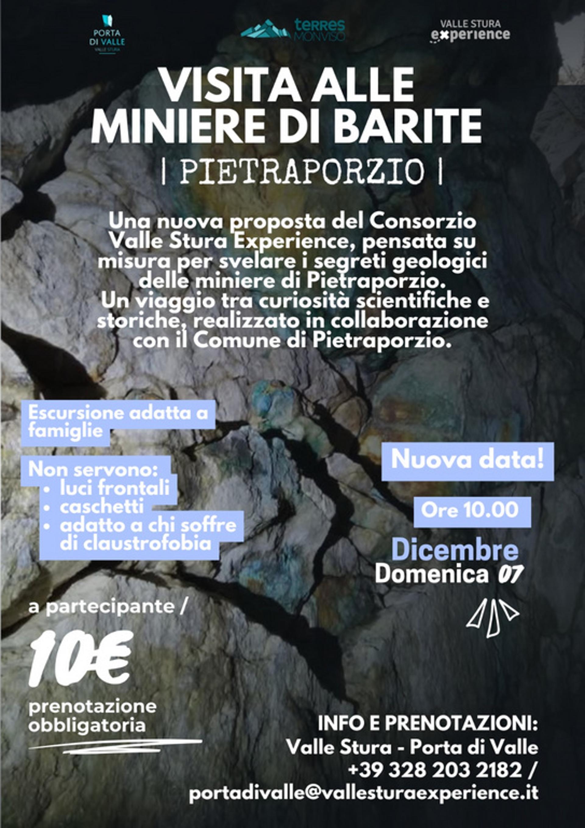 Domenica 7 dicembre, alle ore 10, il Consorzio Valle Stura Experience organizza le visite guidate in compagnia di Stefano Melchio, esperto geologo del territorio, alle miniere di barite a Pietraporzio.