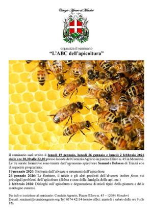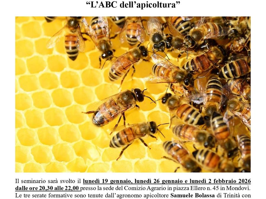 Il Comizio Agrario organizza il seminario “L’ABC dell’apicoltura” che si terrà lunedì 19 gennaio, lunedì 26 gennaio e lunedì 2 febbraio 2026 dalle ore 20,30 alle 22 presso la sede del Comizio Agrario in piazza Ellero n. 45 in Mondovì. Le tre serate formative sono tenute dall’agronomo apicoltore Samuele Bolassa di Trinità.