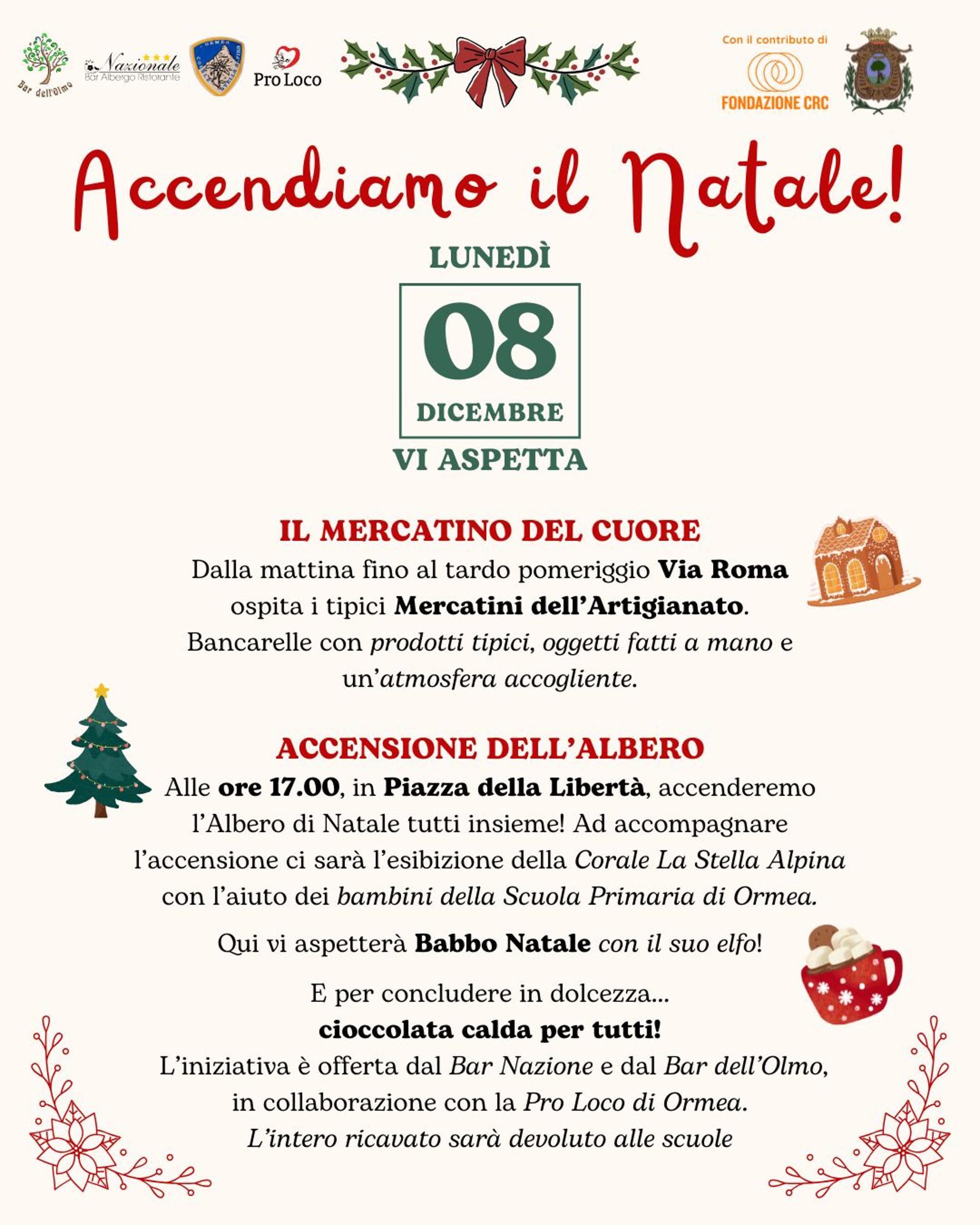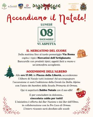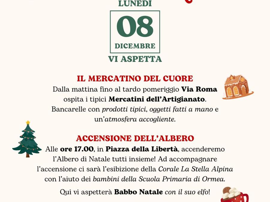 -Accensione dell’Albero, alle 17:00 in Piazza della Libertà, accompagnata dall'animazione della Corale Stella Alpina Ormea e dai bambini della Scuola Primaria.