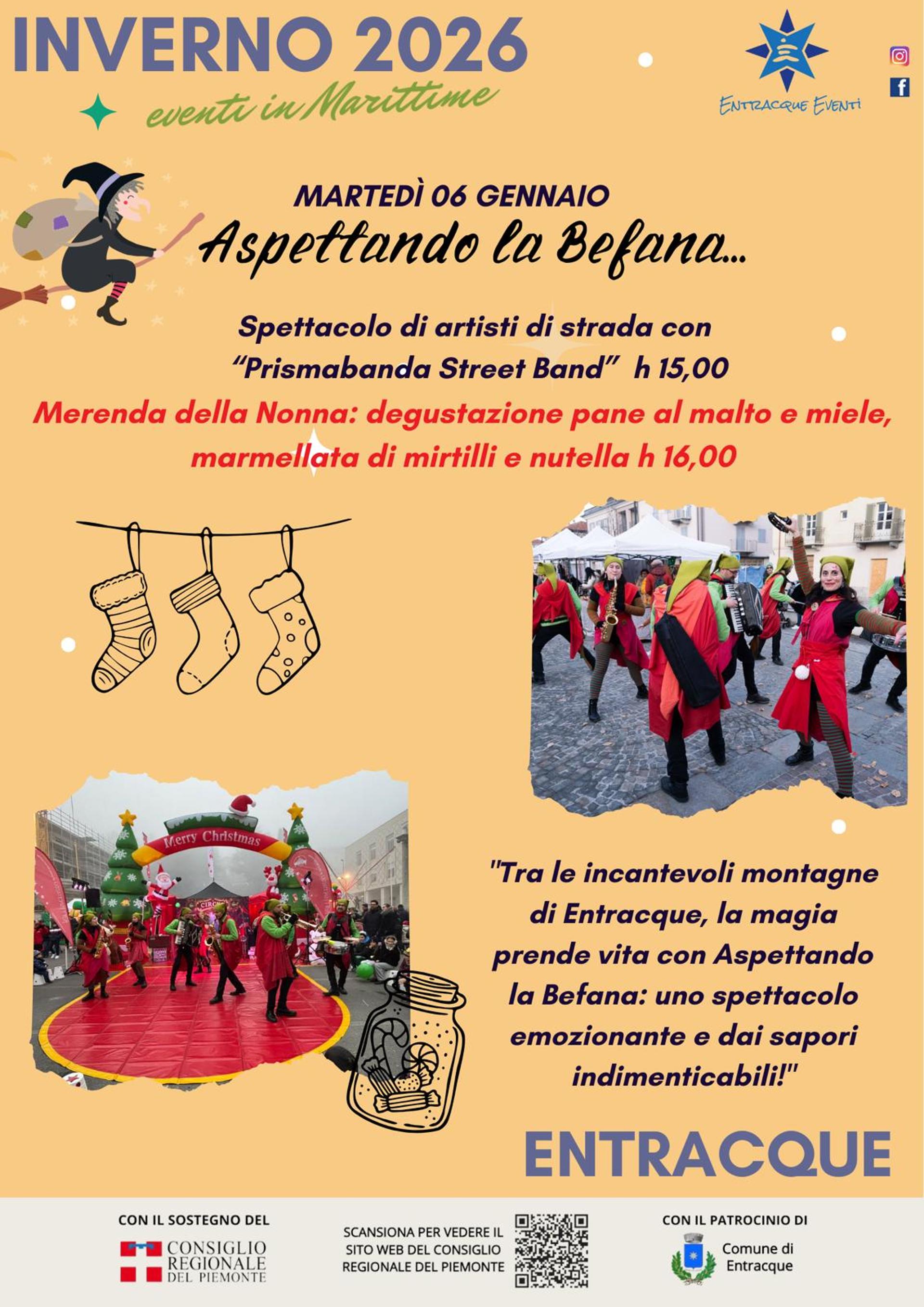 Martedì 6 gennaio, a partire dalle ore 15,00 in Piazza Giustizia e Libertà ad Entracque, si aspetta la Befana. Animazione musicale, merenda della nonna e degustazioni in piazza per festeggiare in compagnia. Ingresso libero.
