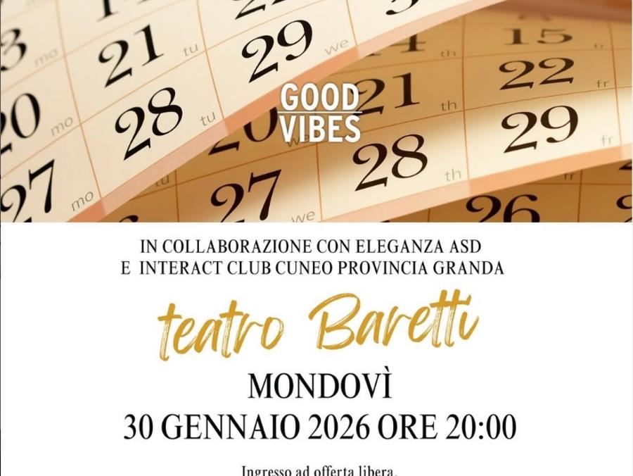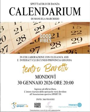 Venerdì 30 gennaio alle ore 20 il Teatro Baretti propone lo spettacolo di danza "Calendarium" di Manuela Marchisio, in collaborazione con Eleganza Asd e Interact Club Cuneo Provincia Granda. Ingresso a offerta libera. Il ricavato verrà devoluto all'Associazione sportiva Sport In.