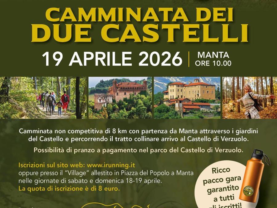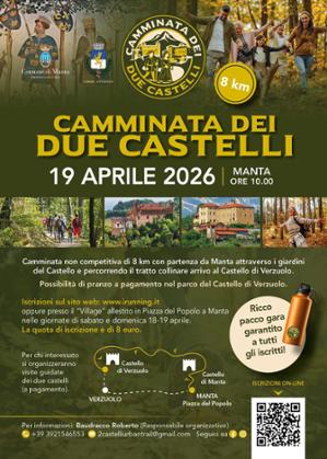 Domenica 19 aprile alle ore 10.00 "Camminata dei Due Castelli": trekking non competitivo di 8 km con partenza dai giardini del Castello della Manta e arrivo al Castello di Verzuolo percorrendo un suggestivo tratto collinare. Possibilità di visite guidate. Quota di iscrizione 8€ con ricco pacco gara.