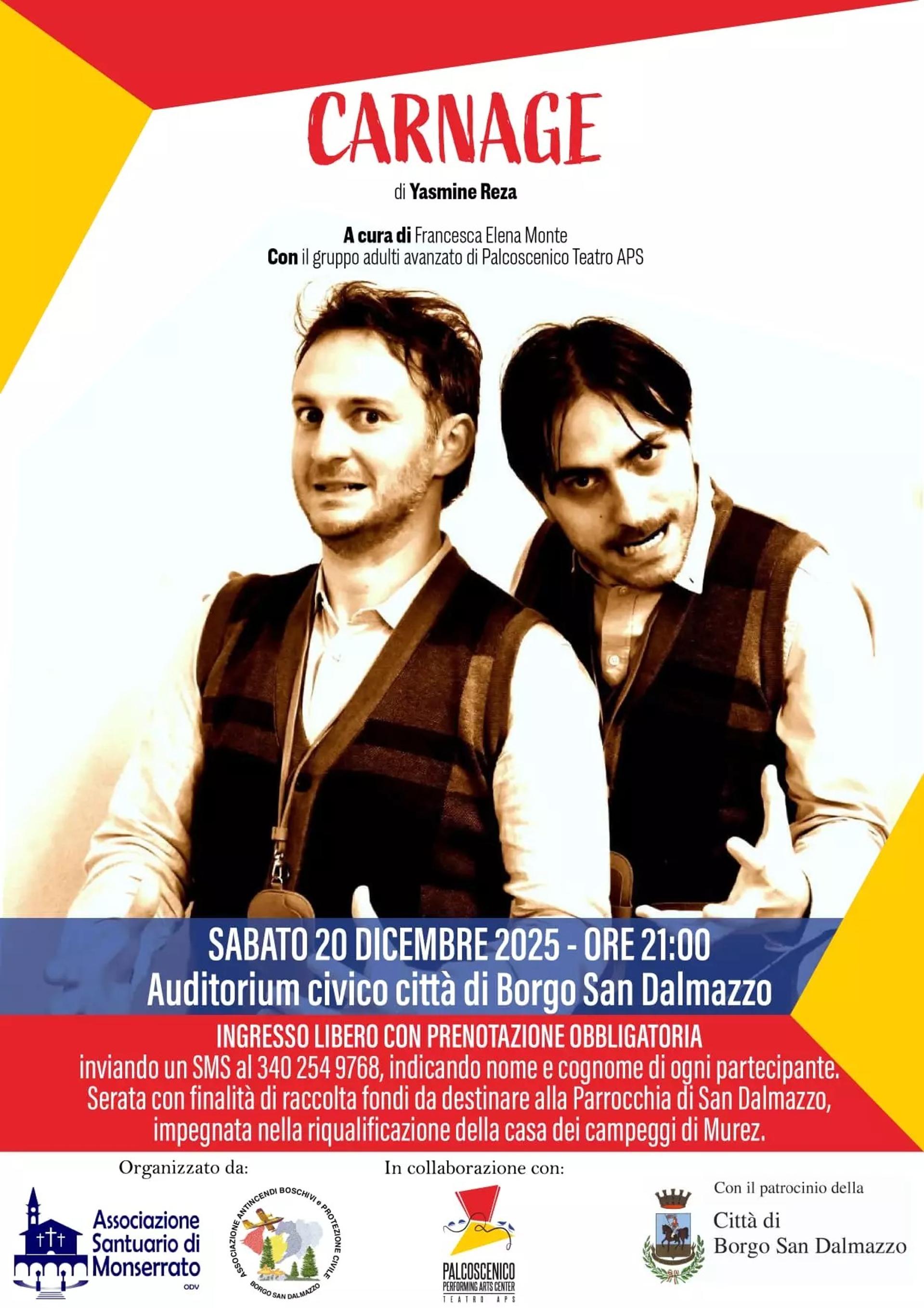 Sabato 20 dicembre 2025, alle ore 21.00, presso l’Auditorium Civico di Borgo San Dalmazzo, andrà in scena “Carnage” di Yasmina Reza, spettacolo teatrale a cura di Francesca Elena Monte e interpretato dal gruppo adulti avanzato di Palcoscenico Teatro APS.