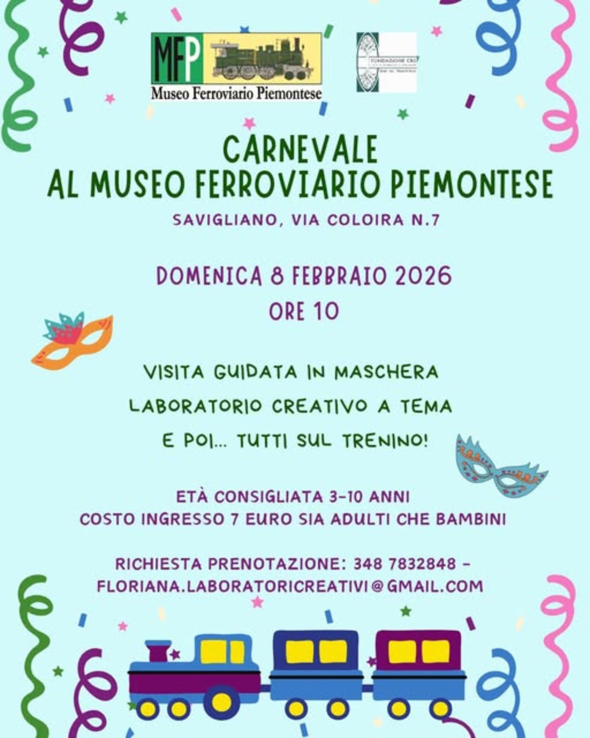 Domenica 8 febbraio, alle ore 10.00, presso il Museo Ferroviario Piemontese di Savigliano torna la festa di Carnevale. E' prevista un'intera mattinata dedicata ai più piccoli con visita guidata in maschera, laboratorio creativo e per concludere, giro sul trenino. Il costo è di 7 euro a persona e la prenotazione è obbligatoria.