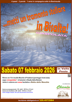 Sabato 7 febbraio si terrà una ciaspolata al tramonto in Bisalta, con salita verso l’osservatorio del Morteis e osservazione del cielo stellato. Ritrovo ore 16.00 in località Meschie di Pradeboni e rientro serale con cena facoltativa a Baita delle Meschie.