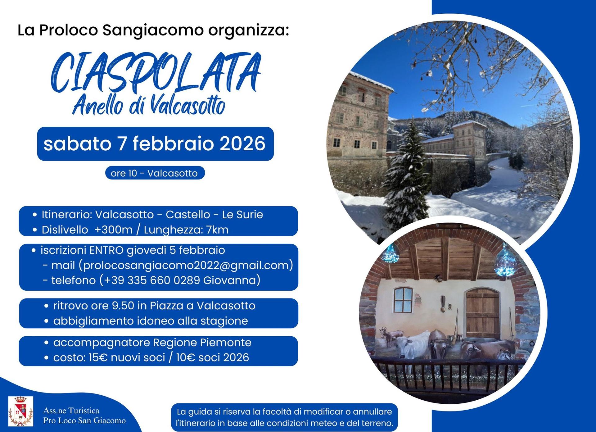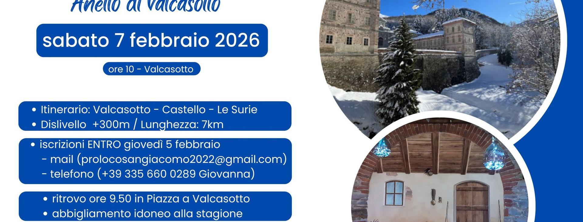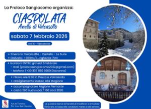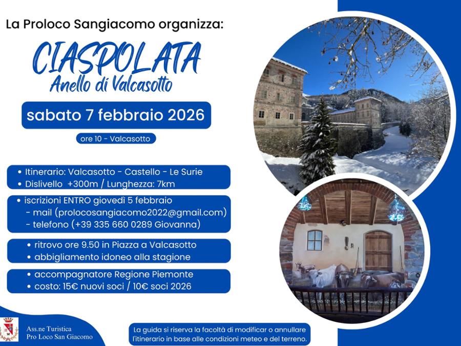 Sabato 7 febbraio la Pro Loco San Giacomo organizza una "Ciaspolata - Anello di Valcasotto". Il ritrovo alle ore 9:50 in piazza a Valcasotto. L'iscrizione entro giovedì 5 febbraio via email o per telefono è obbligatoria e la quota di partecipazione è di 15 euro per i nuovi soci e di 10 euro per i soci 2026.