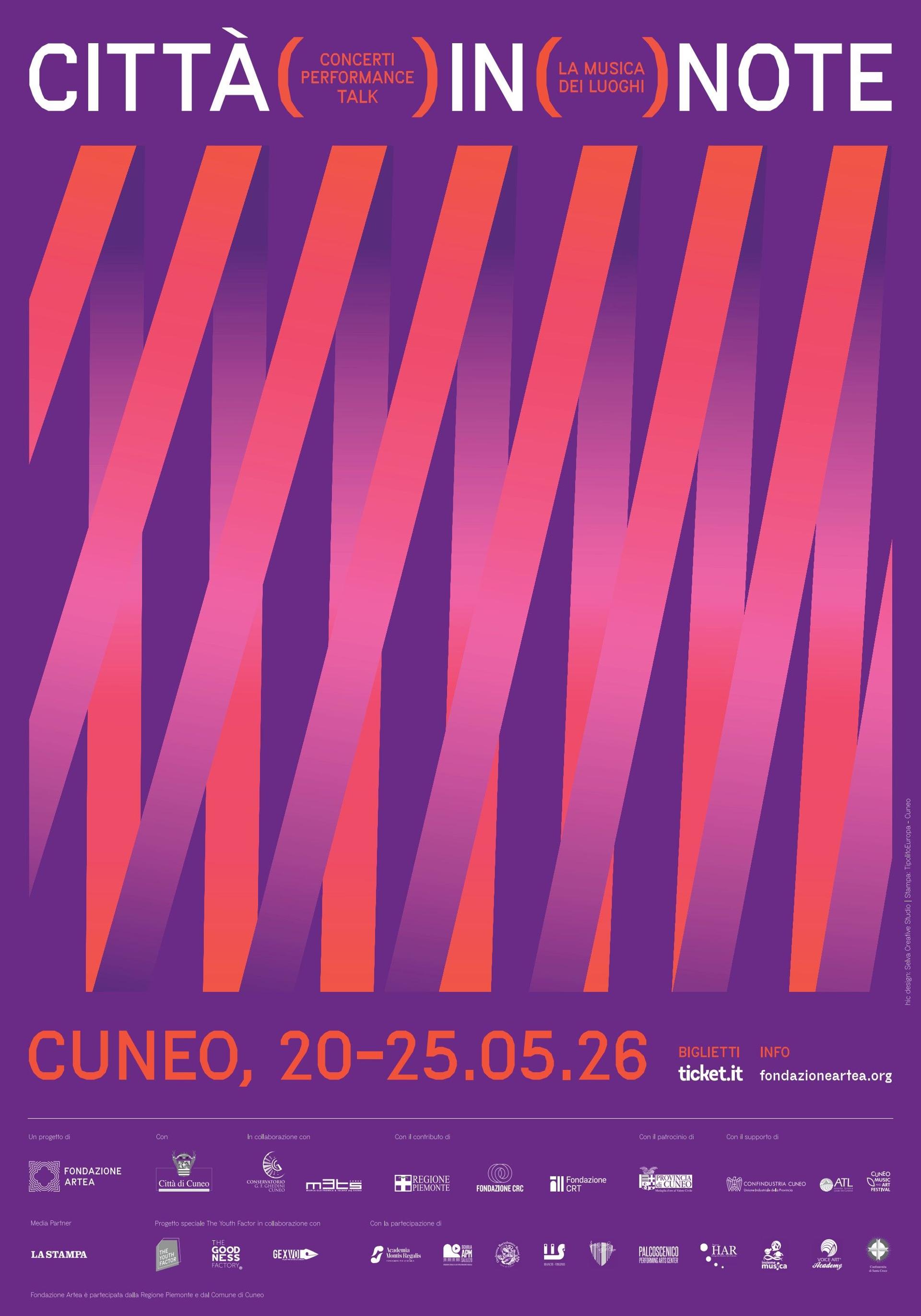 Sesta edizione per l’appuntamento più atteso della primavera cuneese: il festival “Città in note. La musica dei luoghi” torna dal 20 al 25 maggio ad animare il capoluogo della provincia Granda. Concerti, performance, workshop e incontri trasformeranno i più suggestivi luoghi della città in palcoscenici vibranti mettendone in luce il grande valore storico, architettonico e naturale. Programma presto disponibile sul sito della Fondazione Artea.
