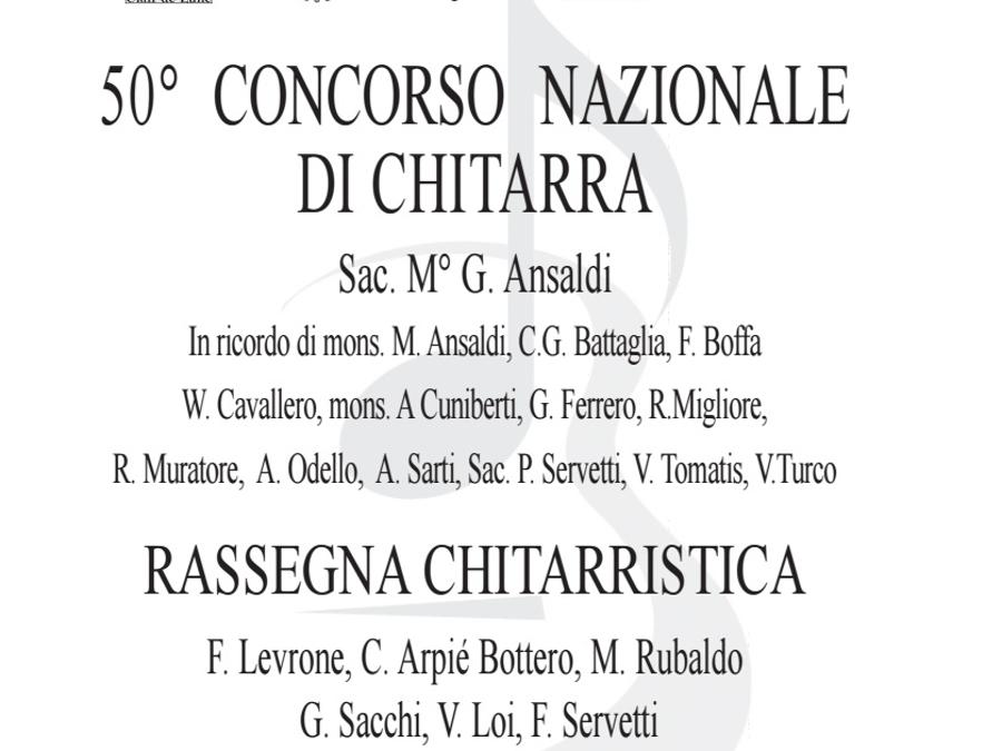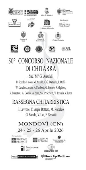 Arriva dal 24 al 26 aprile la 50° edizione il “Concorso nazionale di chitarra” che si consolida come iniziativa musicale e culturale di prestigio, capace di dare lustro a tutta la provincia Granda. Il concorso che si terrà a Mondovì, dedicato alla memoria di alcuni illustri sacerdoti e personaggi monregalesi scomparsi, rappresenta anche oggi una preziosa occasione per avvicinare le nuove generazioni alla conoscenza della musica ed in particolare della chitarra classica. Agli amanti di questo genere di suoni viene offerta l’opportunità di ascoltare un’eccezionale scaletta di esecuzioni.