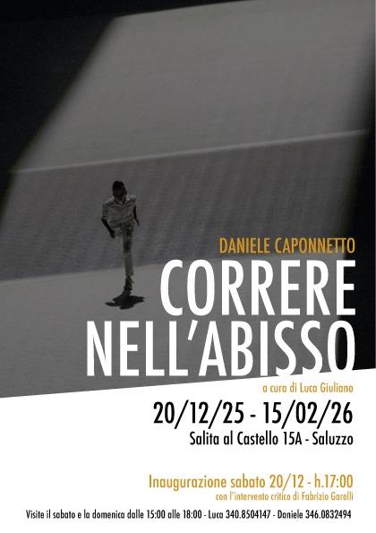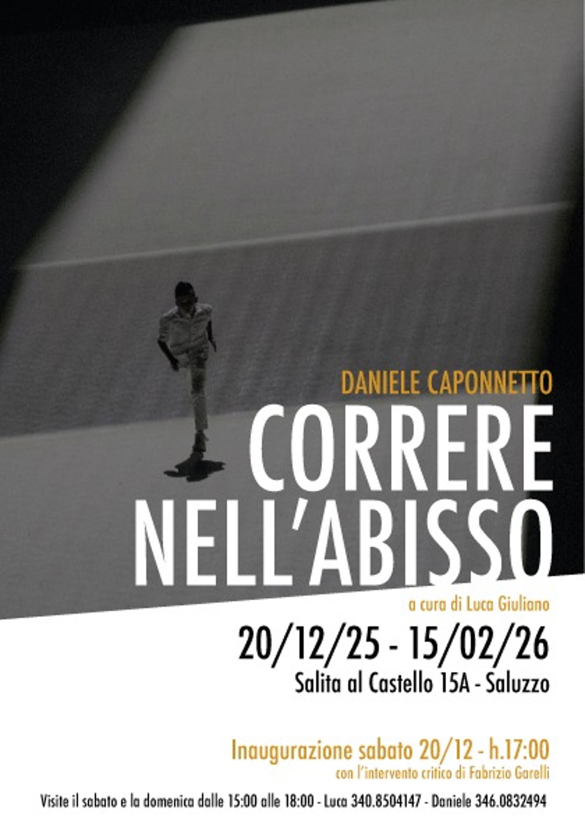 Negli spazi dell'atelier di Salita al Castello 15-A a Saluzzo, fino a domenica 15 febbraio è possibile visitare la mostra fotografica "Correre nell'abisso", con gli scatti realizzati dal reporter Daniele Caponnetto. La selezione delle fotografie e la cura dell'allestimento sono di Luca Giuliano. Visite il sabato e la domenica dalle 15.00 alle 18.00, per maggiori informazioni contattare +39 340 850 4147 (Luca) o +39 346 083 2494 (Daniele).