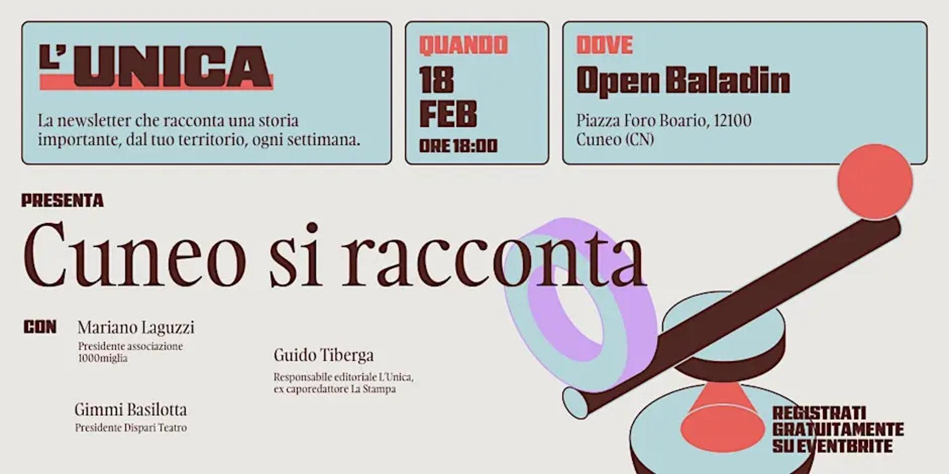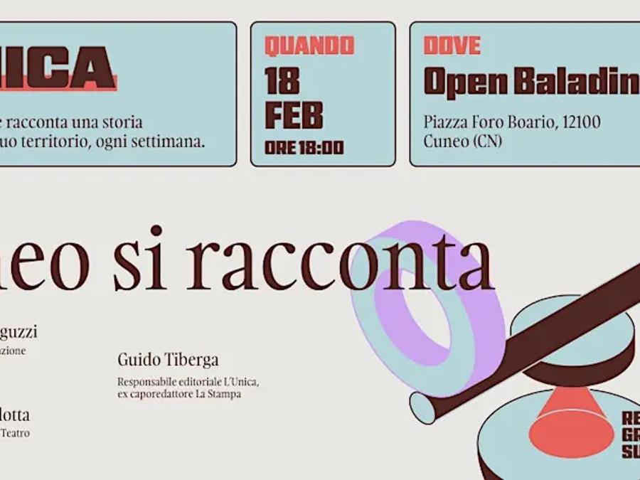 Il 18 febbraio 2026 alle ore 18 presso OpenBaladin, Piazza Foro Boario, si terrà Cuneo si racconta, il secondo appuntamento dal vivo de L’Unica, la newsletter che racconta ogni settimana una storia importante dal territorio. Una serata dedicata alle storie della città, con il responsabile editoriale Guido Tiberga in dialogo con Mariano Laguzzi, Presidente dell'associazione 1000miglia e Gimmi Basilotta, Presidente Dispari Teatro, per osservare più da vicino Cuneo e scoprire come il giornalismo locale può tornare tra le persone. Segue momento conviviale. Ingresso gratuito, preferibile con registrazione su Eventbrite.