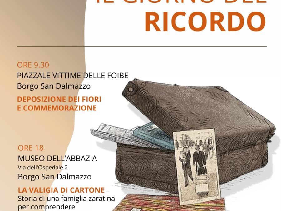 In occasione del Giorno del Ricordo il Comune di Borgo San Dalmazzo promuove due appuntamenti dedicati alla commemorazione e all’approfondimento storico. Al mattino si terrà un momento istituzionale mentre, alle ore 18, presso il Museo dell’Abbazia , è in programma l’incontro pubblico “La valigia di cartone. Storia di una famiglia zaratina per comprendere il Giorno del Ricordo: memoria, esodo e radici ritrovate”. Ingresso libero.