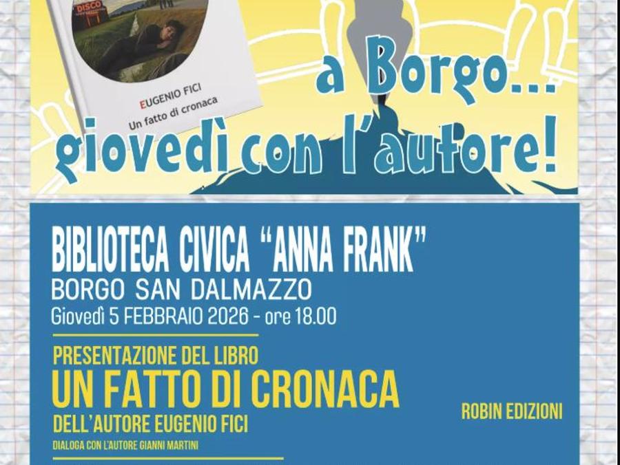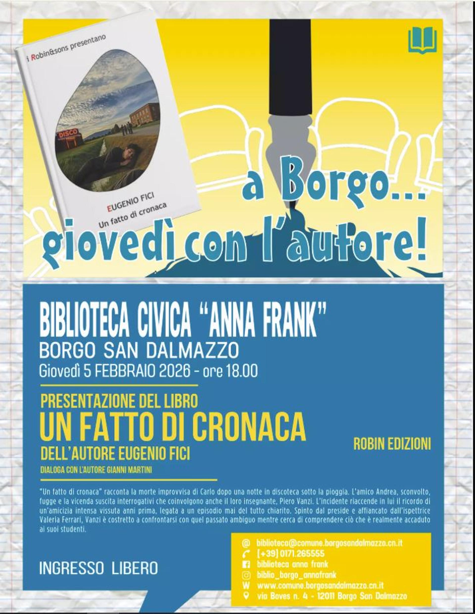 Giovedì 5 febbraio, alle ore 18, presso la Biblioteca Civica “Anna Frank” di Borgo San Dalmazzo, si terrà un nuovo appuntamento del ciclo “A Borgo… giovedì con l’autore!”. Protagonista dell’incontro sarà Eugenio Fici, autore del romanzo Un fatto di cronaca, edito da Robin Edizioni. Lo scrittore dialogherà con il giornalista Gianni Martini. Ingresso libero.
