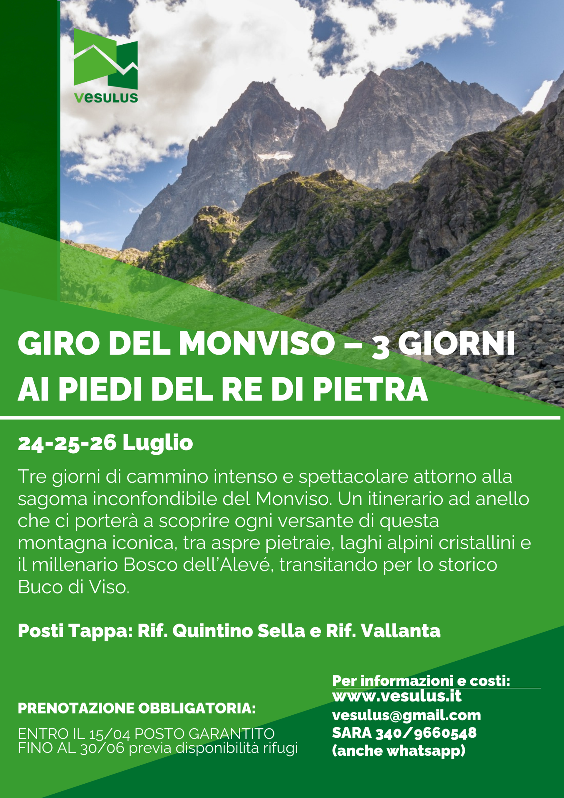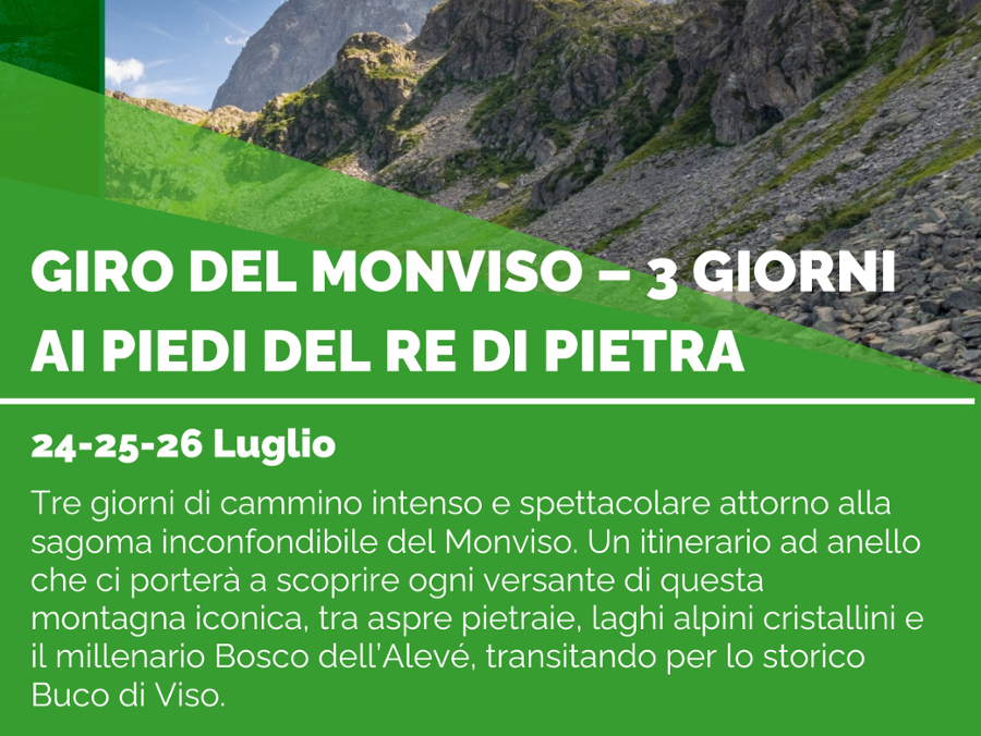 DESCRIZIONE ESCURSIONE: Tre giorni di cammino intenso e spettacolare attorno alla sagoma inconfondibile del Monviso. Un itinerario ad anello che ci porterà a scoprire ogni versante di questa montagna iconica, attraversando aspre pietraie, laghi alpini cristallini e il millenario Bosco dell’Alevé. Un’esperienza di condivisione e fatica ripagata da panorami che spaziano dalle Alpi Marittime fino al massiccio del Monte Rosa.