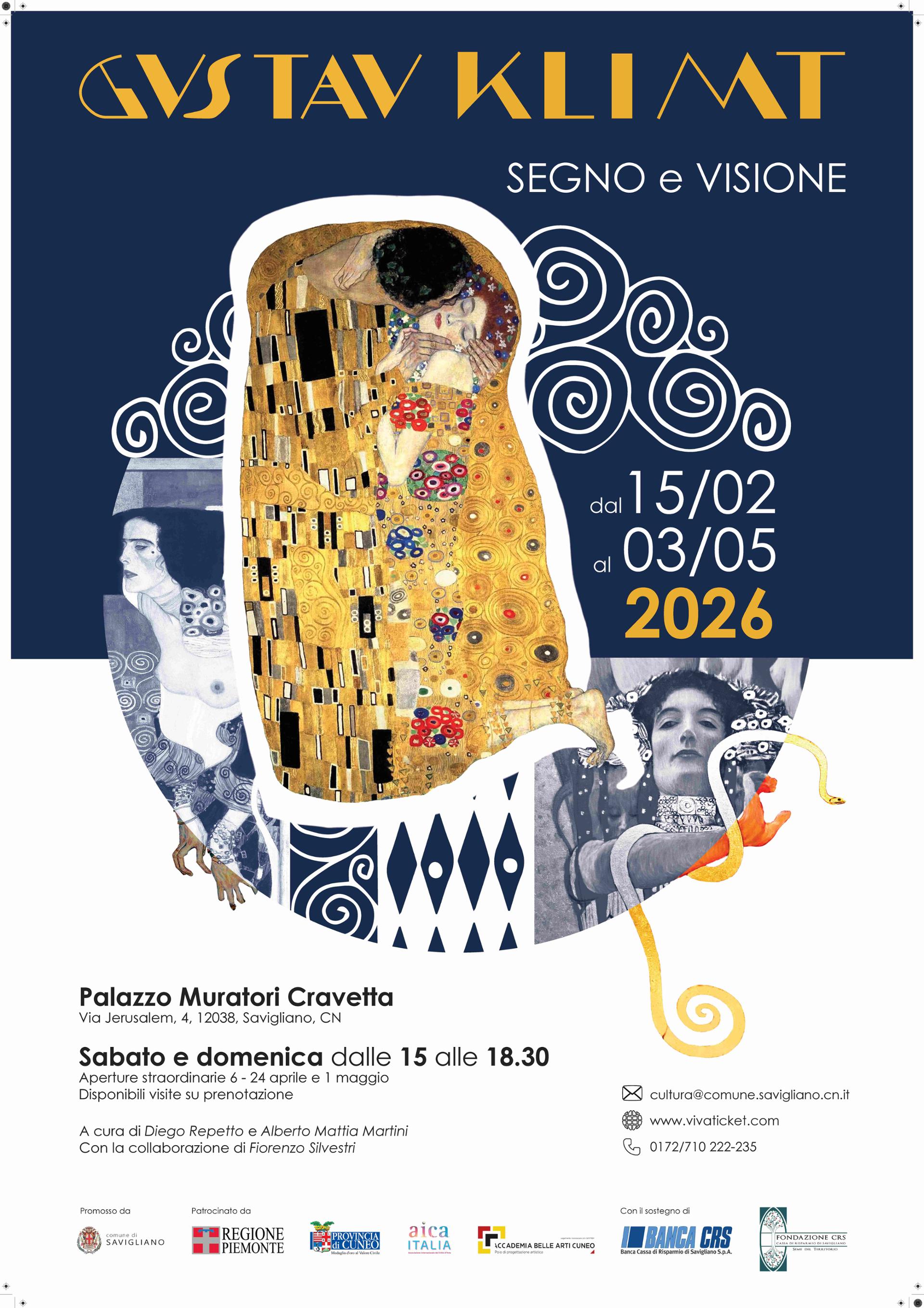 Dal 15 febbraio al 3 maggio, presso le suggestive sale di Palazzo Muratori Cravetta a Savigliano, mostra "Gustav Klimt: Segno e Visione". Esposizione collotipie di Gustav Klimt che esprimono l’essenza della sua ricerca artistica, capace di restituire, attraverso il segno, le sfumature e la ricchezza ornamentale, l’intensità della sua visione poetica.
