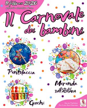 Domenica 8 febbraio la Pro Loco San Giacomo organizza, presso il dehors del Bar Adriana, "Il Carnevale dei bambini". Dalle ore 10:00 ci saranno giochi, merenda per i bambini presenti e la pentolaccia da rompere.