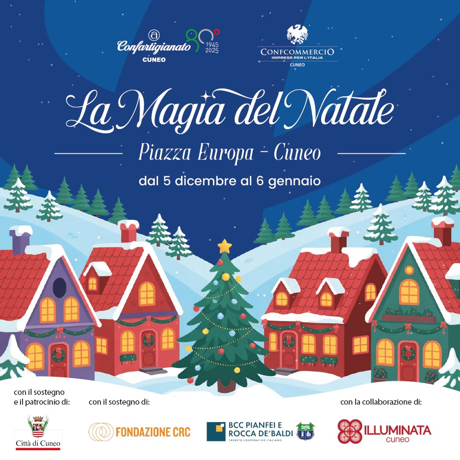 Piazza Europa a Cuneo si anima con la "Magia del Natale", un evento ricco di spettacoli e laboratori per grandi e piccini, in programma fino al 6 gennaio 2026. Tra le proposte: le “Letterine a Babbo Natale”, uno spazio dedicato alla scrittura con animazione, la “Fabbrica di Babbo Natale” con laboratori creativi guidati dagli elfi. A rallegrare l’atmosfera arriveranno i Trampolieri LED e la street band natalizia, che porterà musica per le vie del centro. Non mancherà lo spettacolo di bolle di sapone con la fata delle nevi, e i “Giochi di una volta”, rivolti sia ai piccini che ai grandi. Strutture giganti, rigorosamente in legno, nate dal riuso, riproporranno la semplicità e l’allegria dei giochi del passato.