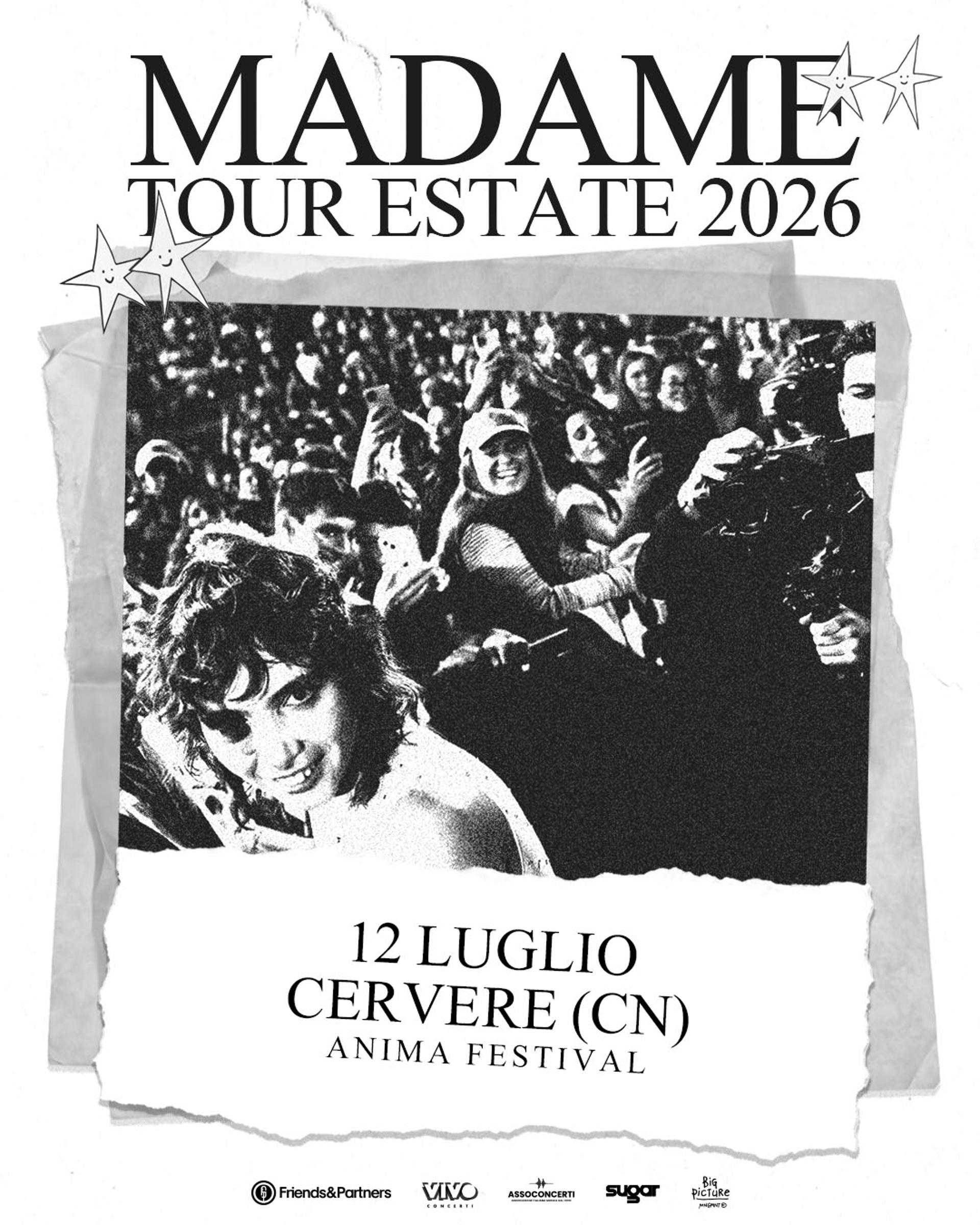 Domenica 12 luglio, il palco dell’Anfiteatro dell'Anima a Cervere si accenderà con l’energia di Madame, protagonista dell’Anima Festival con il suo attesissimo “Tour Estate 2026”. L’artista, tra le voci più amate della scena musicale italiana, torna ufficialmente dal vivo dopo un lungo periodo di pausa, pronta a emozionare il pubblico con uno spettacolo intenso e coinvolgente. Per acquistare i biglietti clicca qui.