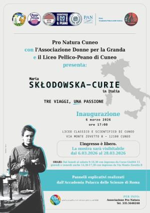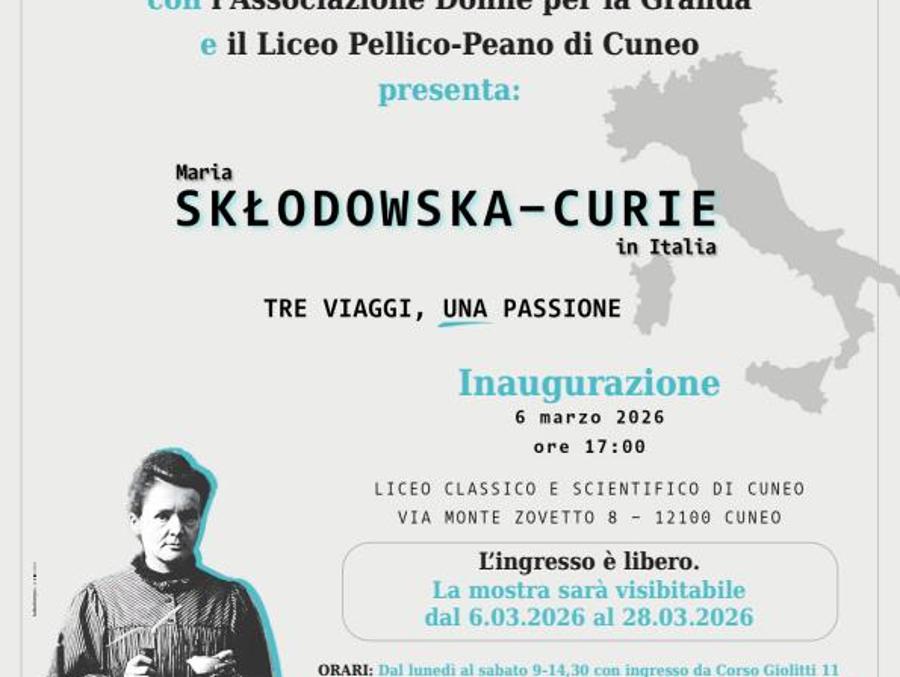 Dal 6 al 28 marzo, nella Sala del Liceo Classico-Scientifico, in corso Giolitti n. 11 a Cuneo, sarà visitabile la mostra dedicata alla grande scienziata di origine polacca, vincitrice di due Premi Nobel, Maria Skłodowska Curie. L’esposizione sarà aperta al pubblico dal lunedì al sabato dalle 9.00 alle 14.30, con ingresso da corso Giolitti 11, e il giovedì e il venerdì anche dalle 14.30 alle 17.30, con ingresso da via Monte Zovetto 8. Ingresso libero.