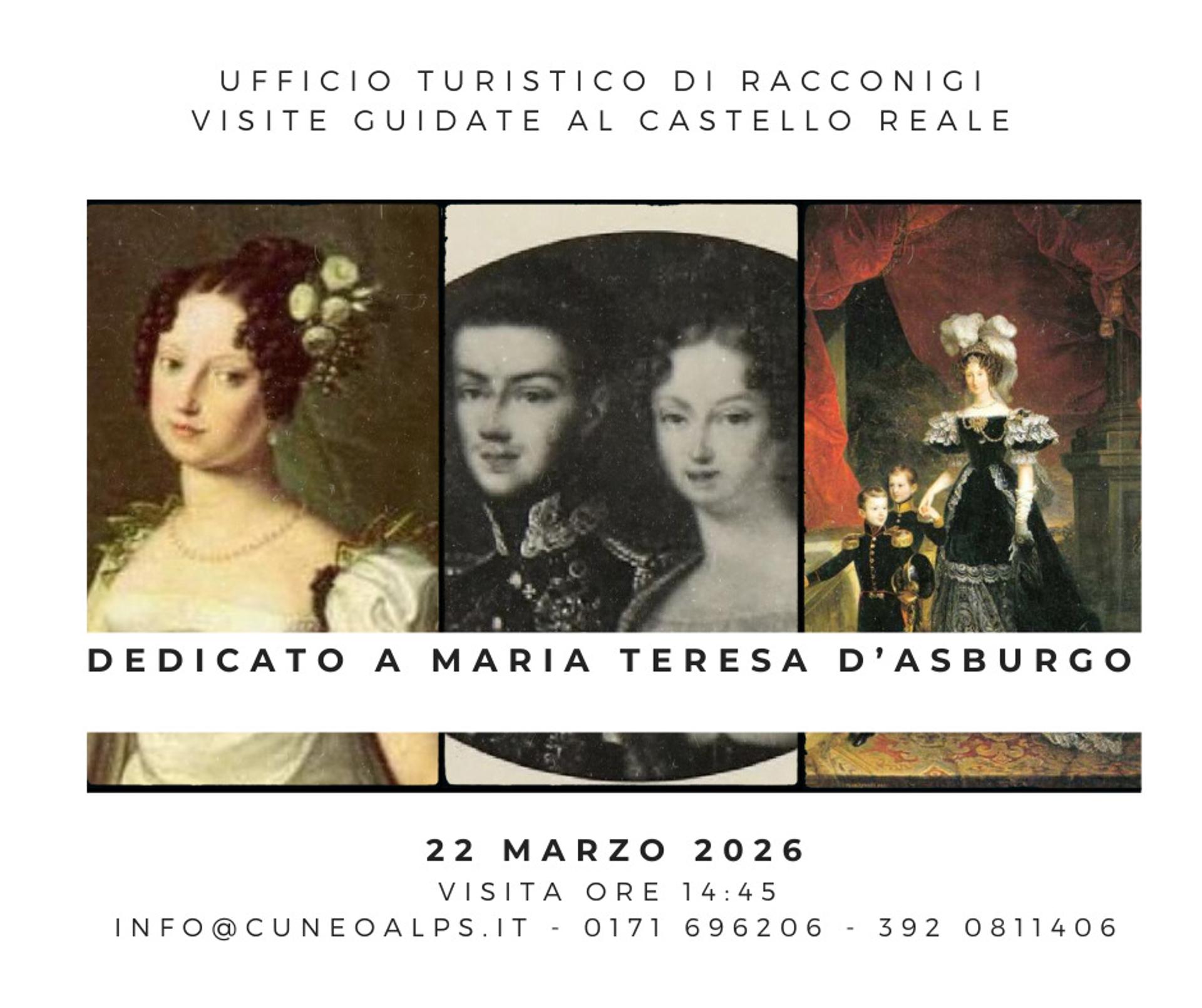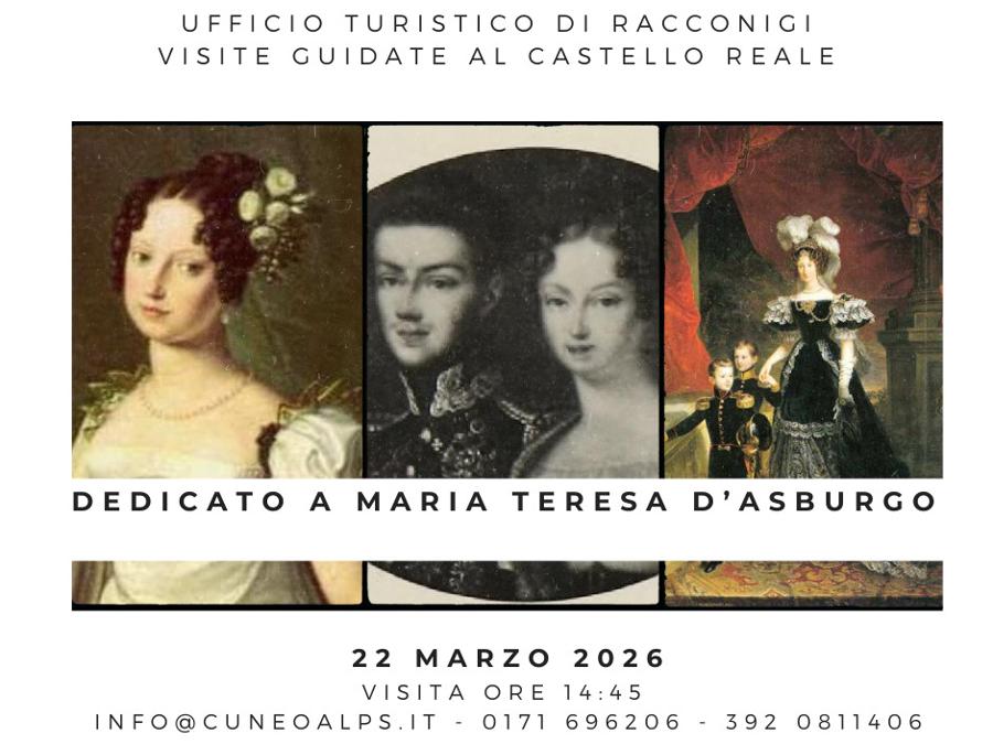 Domenica 22 marzo, alle ore 14.45, CuneoAlps organizza una speciale visita guidata al Castello di Racconigi. Particolare attenzione verrà posta sulla figura di Maria Teresa d'Asburgo moglie di Carlo Alberto di Savoia. Il costo del biglietto intero è di 5 euro, gratuito per i minori di 7 anni.