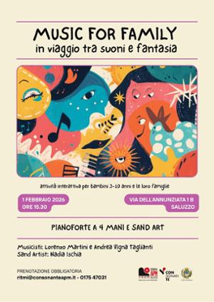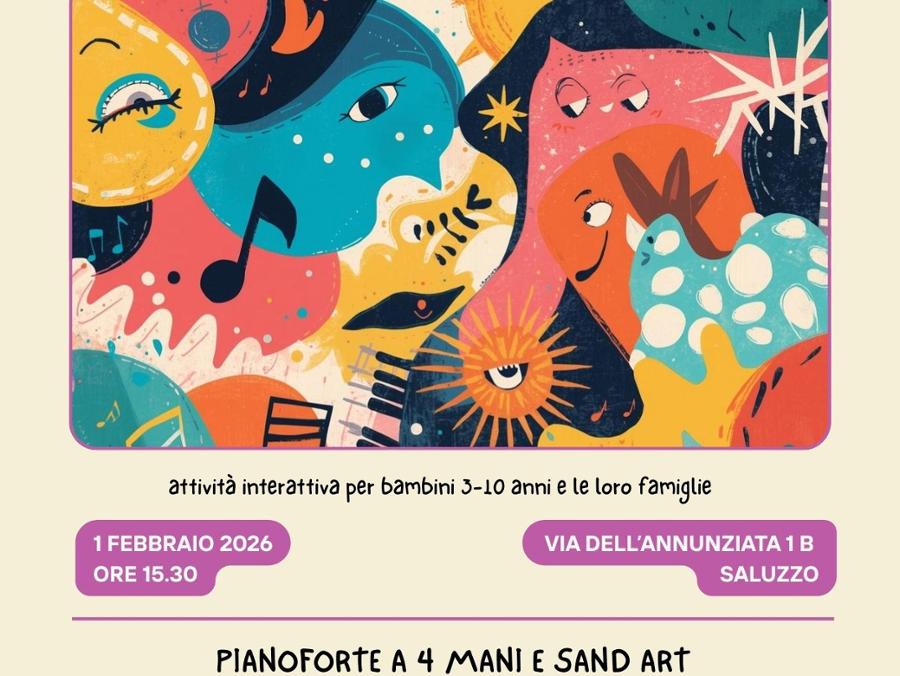 Domenica 1 febbraio alle ore 15.30, presso la sede della Scuola APM di Saluzzo, primo appuntamento di Music for Family – in viaggio tra suoni e fantasia. Uno spettacolo poetico e coinvolgente, pensato per i bambini dai 3 agli 11 anni, dove la musica dal vivo e la Sand Art si fondono per dare vita a un racconto fatto di emozioni, colori e immaginazione.