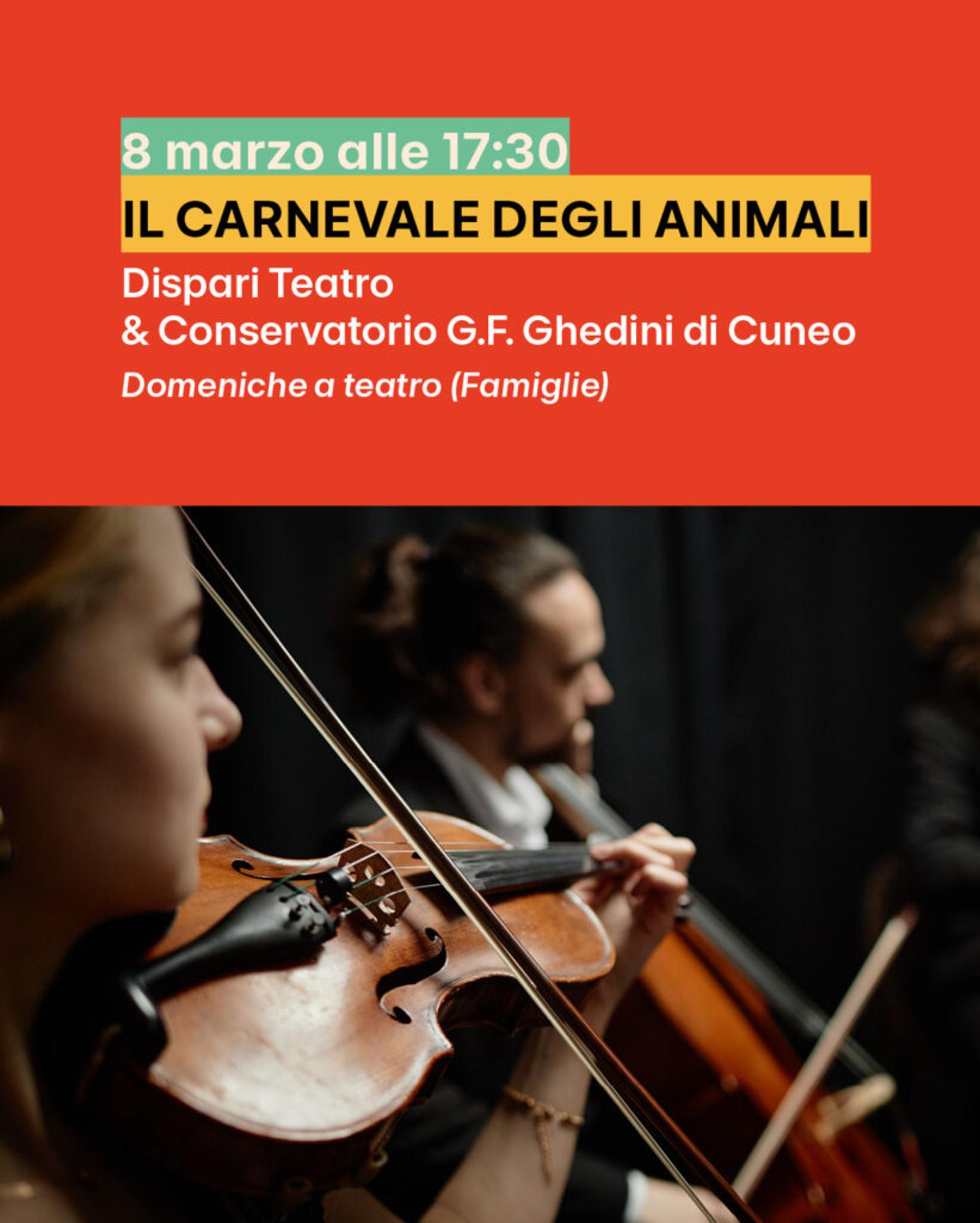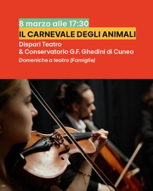 Domenica 8 marzo alle 17.30 a Cuneo, presso l'ex chiesa di Santa Chiara (via Savigliano), andrà in scena "Il carnevale degli animali", uno spettacolo della rassegna per famiglie "Domeniche a Teatro" di Dispari Teatro, in collaborazione con il Conservatorio G. F. Ghedini. Il programma completo della rassegna è disponibile sul sito ufficiale.