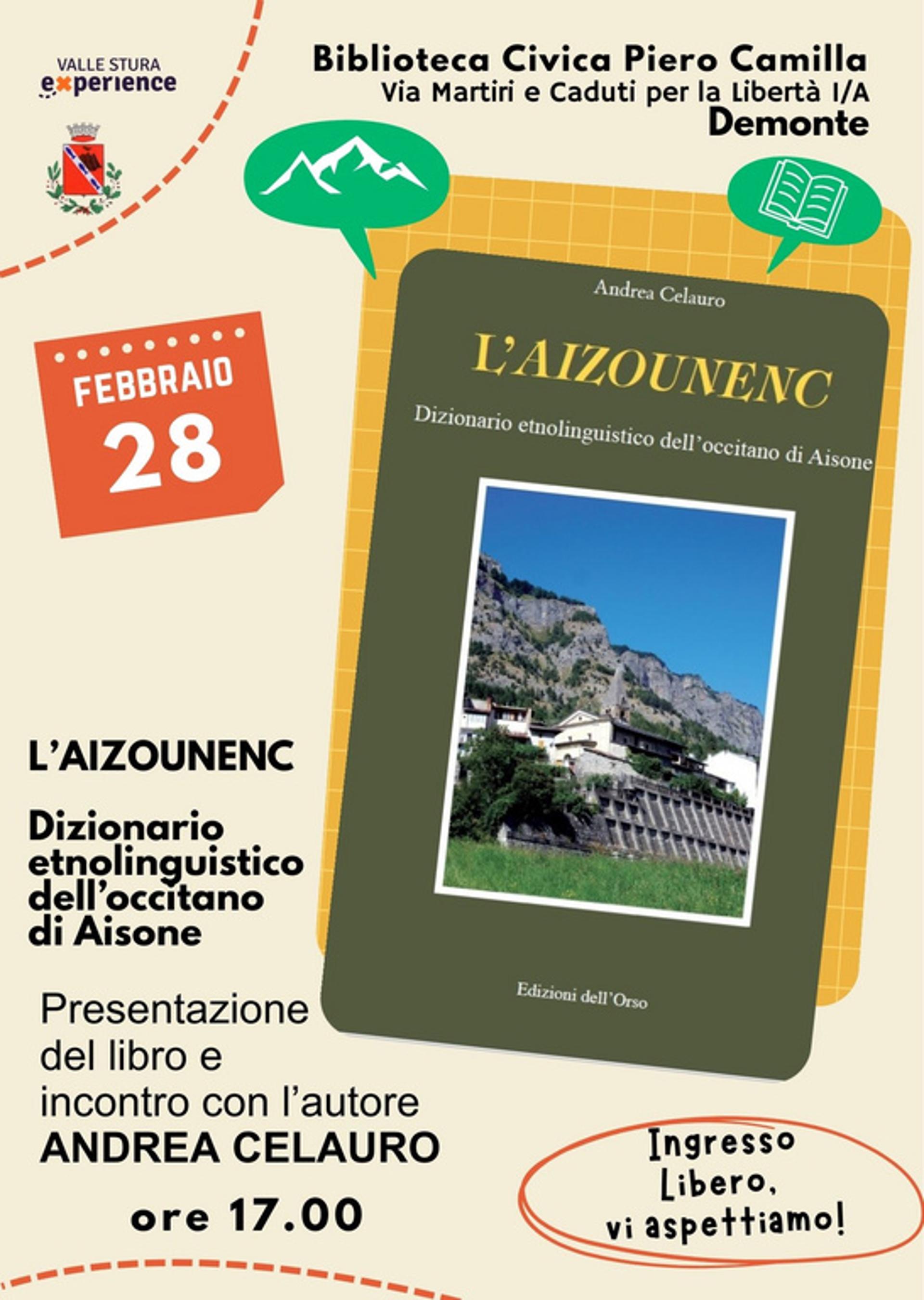 Sabato 28 febbraio, alle ore 17,00 presso la Biblioteca Civica "Piero Camilla" di Demonte, appuntamento con l'autore Andrea Celauro e presentazione del volume "L’Aizounenc - Dizionario etnolinguistico dell’occitano di Aisone". Ingresso libero e gratuito.