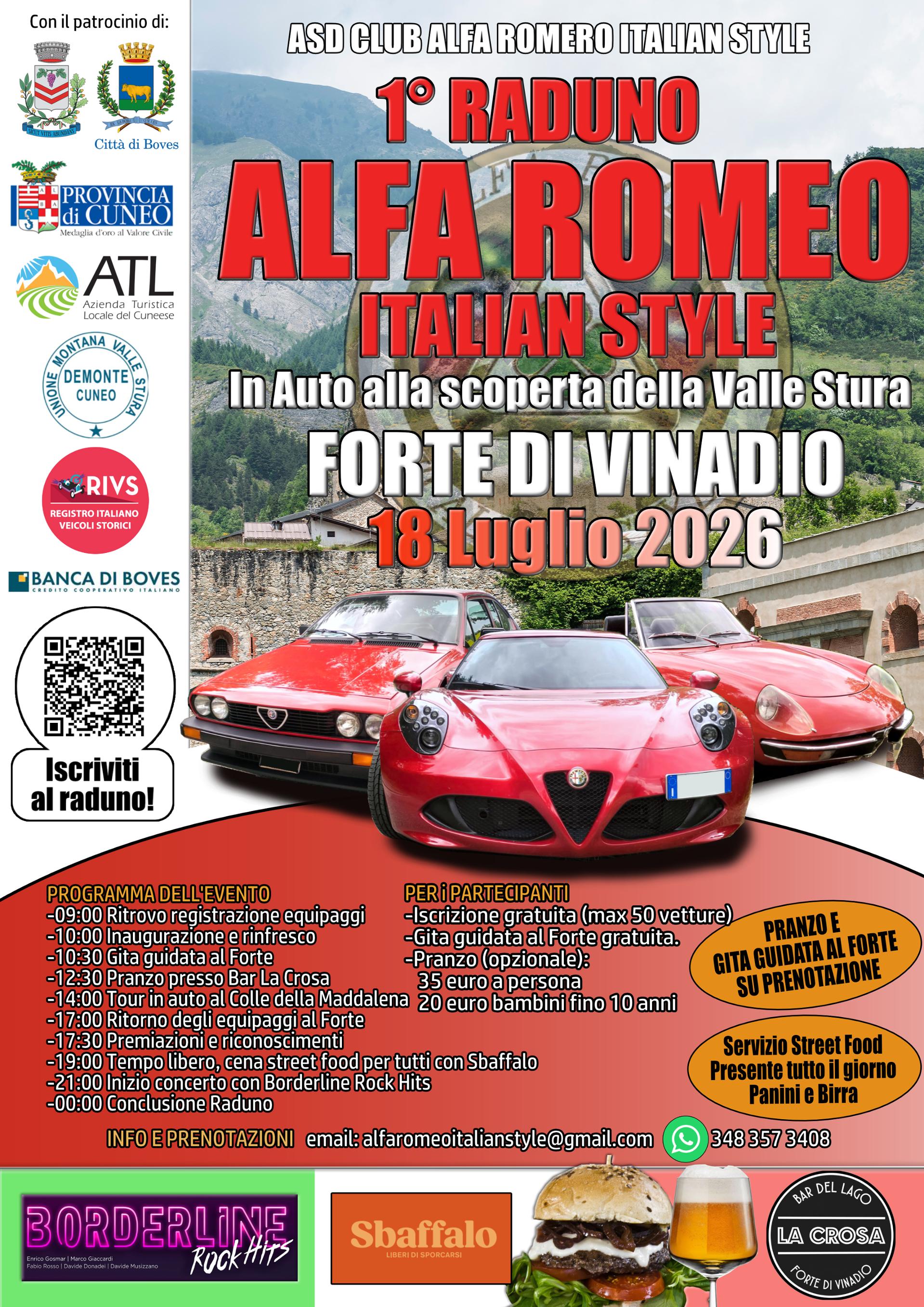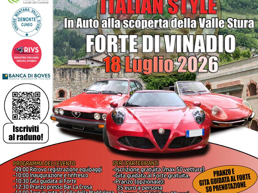Club Alfa Romeo Italian Style di Boves organizza il primo raduno che si terrà il 18 Luglio 2026, all'interno delle mura del Forte di Vinadio. L'evento, che si svolgerà durante l'arco di tutta la giornata, prevede l'arrivo di circa 50 equipaggi da tutta Italia ed Europa , un tour panoramico in auto della vallata, visita guidata al Forte di Vinadio, cibo, bevande e musica dal vivo. Iscrizione gratuita al raduno (max 50 vetture) e alla visita guidata al Forte. Pranzo: 35€ a persona, 20€ bambini fino ai 10 anni. Prenotazioni tramite i contatti in calce.