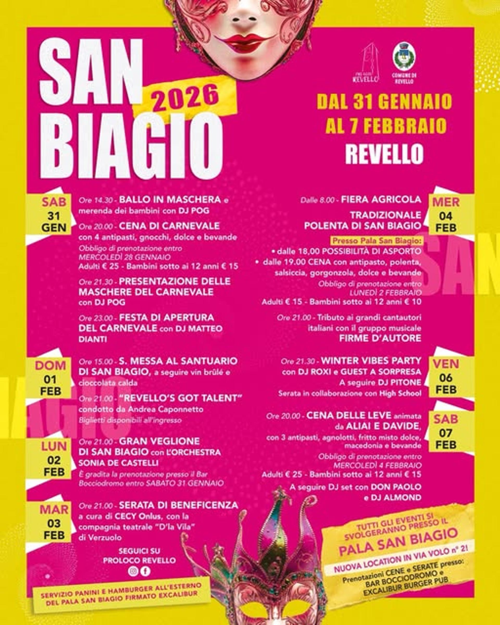 I festeggiamenti iniziano sabato 31 gennaio alle ore 14.30 con il ballo in maschera e la merenda per i bambini insieme a DJ Pog, proseguiti alle ore 20.00 dalla cena di Carnevale; la serata continua alle ore 21.30 con la presentazione delle maschere e alle ore 23.00 con la festa di apertura del Carnevale animata da DJ Matteo Dianti. Domenica 1° febbraio l'appuntamento è alle ore 15 per la Santa Messa al Santuario seguita da vin brûlé e cioccolata calda, mentre alle ore 21 si svolge lo spettacolo Revello's Got Talent. Lunedì 2 febbraio alle ore 21 si tiene il Gran Veglione con l'orchestra Sonia De Castelli e martedì 3 febbraio, alla stessa ora, la serata di beneficenza con la compagnia teatrale D'la Vila. Mercoledì 4 febbraio si apre alle ore 8 con la fiera agricola, mentre per la tradizionale polenta di San Biagio l'asporto è disponibile dalle ore 18 e la cena servita inizia alle ore 19, conclusa alle ore 21dal tributo musicale Firme d'Autore. Venerdì 6 febbraio il divertimento riprende alle ore 21.30 con il Winter Vibes Party (DJ Roxi, Ludwig e DJ Pitone), per terminare sabato 7 febbraio alle ore 20 con la cena delle leve animata da Aliai e Davide, seguita dal DJ set finale con Don Paolo e DJ Almond.