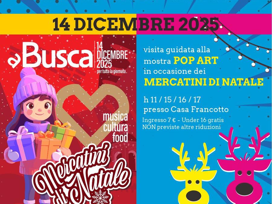 In occasione del mercatino di Natale che si terrà nelle vie del centro cittadino di Busca domenica 14 dicembre 2025, la mostra sarà aperta dalle 10 alle 12 e dalle 14,30 alle 18,30. Saranno disponibili, su prenotazione, visite guidate incluse nel biglietto d’ingresso (in via del tutto eccezionale 7€ a persona) nei seguenti orari 11, 15, 16 e 17 per accompagnare il pubblico alla scoperta degli artisti che hanno rivoluzionato l’arte contemporanea.