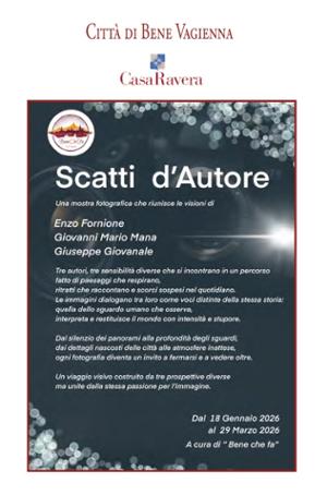 Da domenica 18 gennaio a domenica 29 marzo, Casa Ravera a Bene Vagienna ospita la rassegna fotografica "Scatti d’autore" di Enzo Fornione, Giovanni Mario Mana e Giuseppe Giovenale, a cura di Bene che fa. L’inaugurazione si terrà il 18 gennaio alle ore 10.30. La mostra è aperta nei giorni festivi dalle 10.00 alle 12.00 e dalle 15.00 alle 18.00. Ingresso libero.