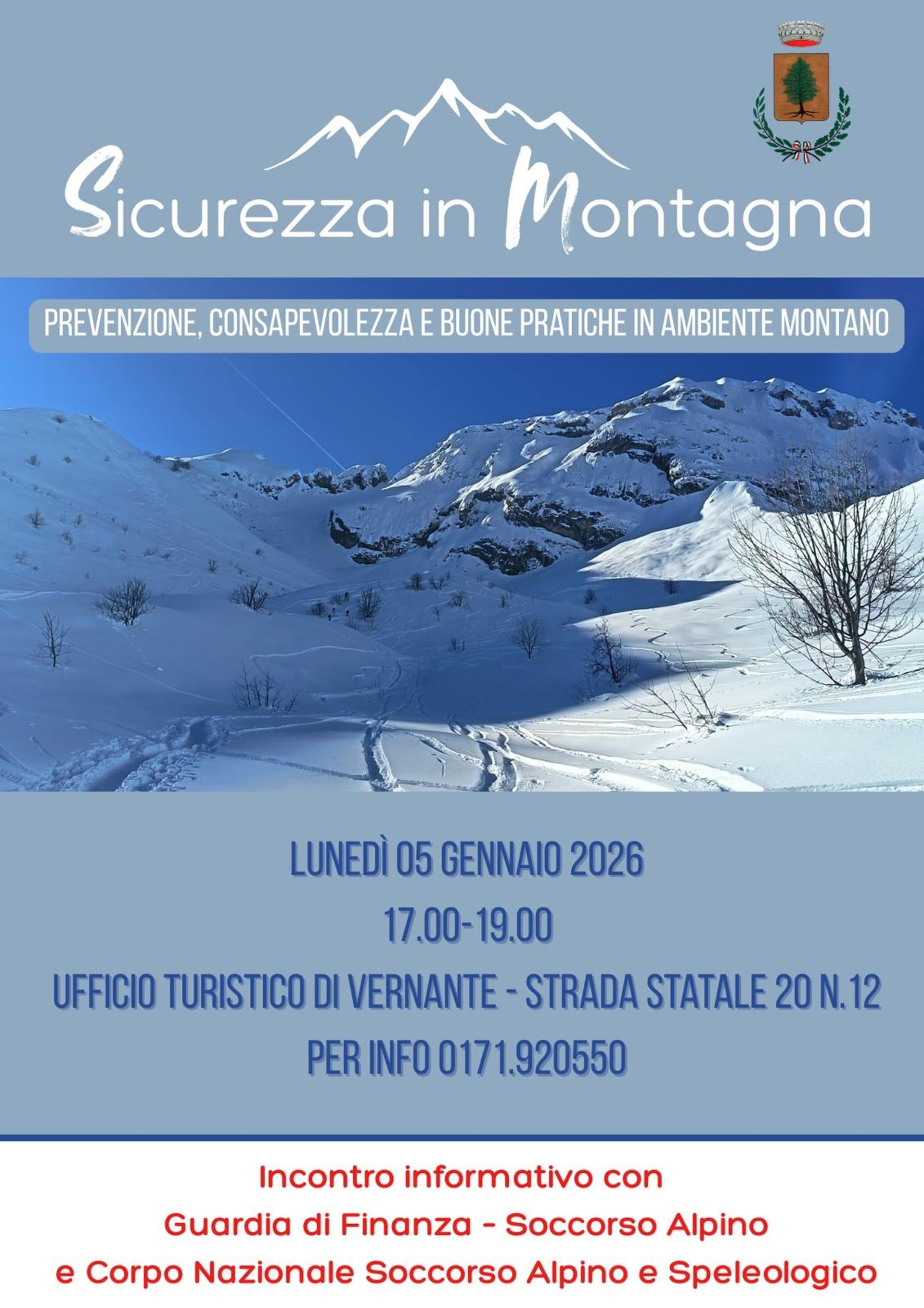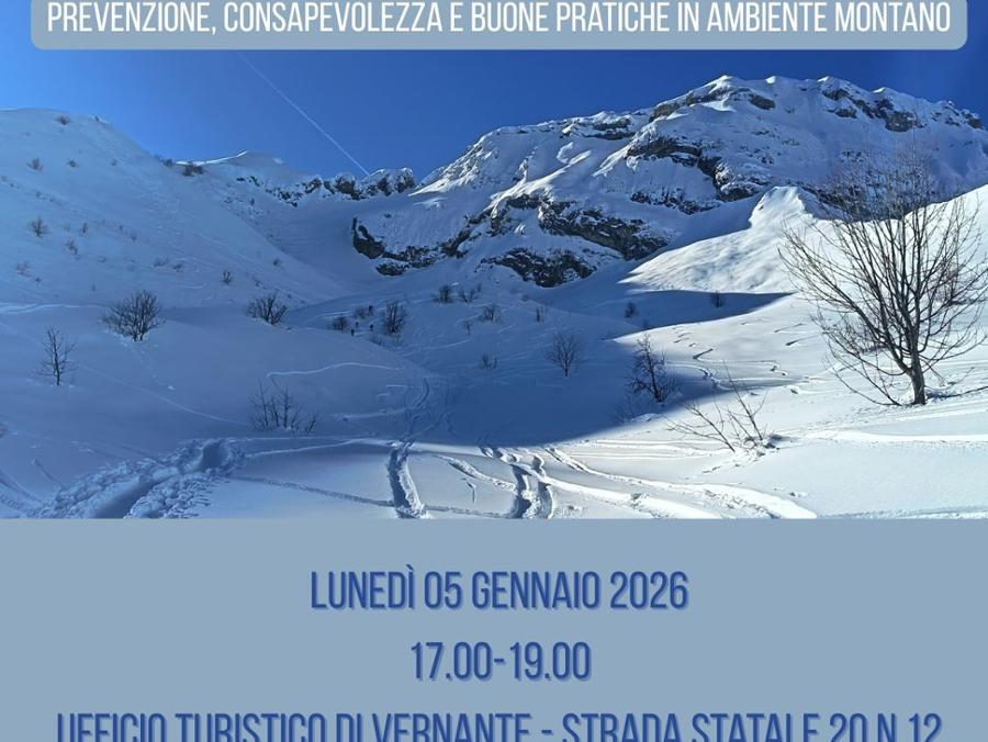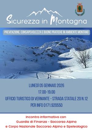 Lunedì 5 gennaio, dalle ore 17:00, si terrà nella sala dell' Ufficio Turistico di Vernante, un incontro formativo, con la Guardia di Finanza e il soccorso alpino, sulla prevenzione, consapevolezza e buone pratiche in ambiente montano. Ingresso libero e gratuito.