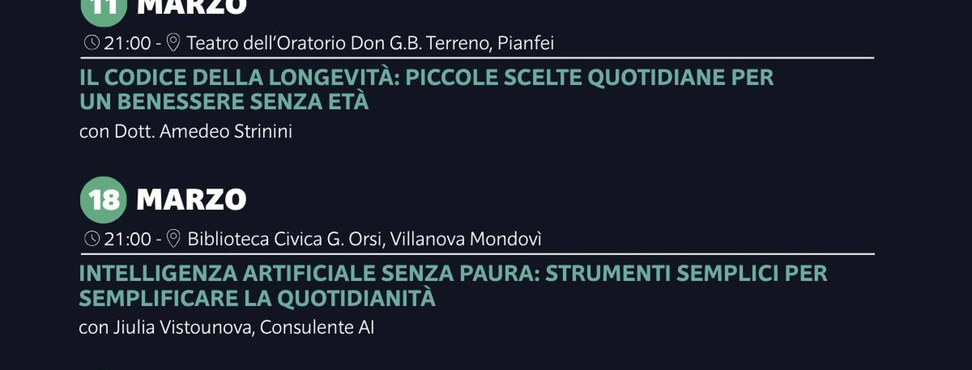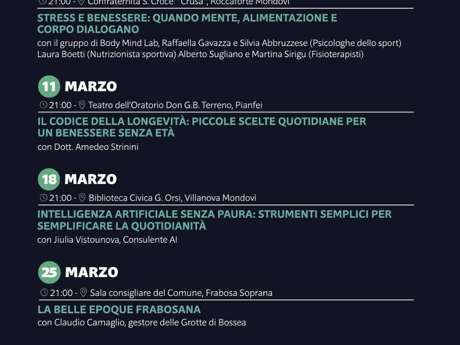 Mercoledì 11 marzo alle ore 21.00 vi aspetta un nuovo appuntamento dell'"Università del Mondolè 2026", una serata culturale dal titolo “Il codice della longevità: piccole scelte quotidiane per un benessere senza età” con il dott. Amedeo Strinini, presso il teatro dell’oratorio Don G.B. Terreno di Pianfei. Ingresso libero. Il programma completo degli incontri è disponibile nella locandina.