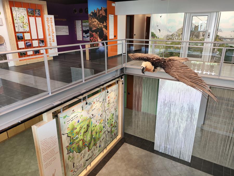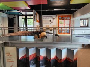 Das Zentrum wird von einer majestätischen Figur dominiert: Ein großer ausgewachsener Bartgeier mit ausgebreiteten Schwingen zieht alle Blicke auf sich. Dank einer immersiven Erfahrung können die Besucher das Gefühl erleben, vom Marguareis bis zum Argentera zu fliegen.