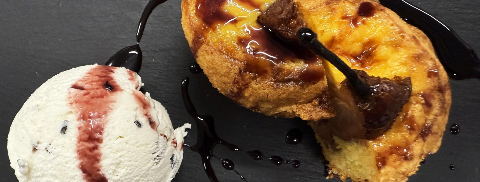 Crostata di pasta frolla a mais con pere cotte al vino e gelato al tartufo