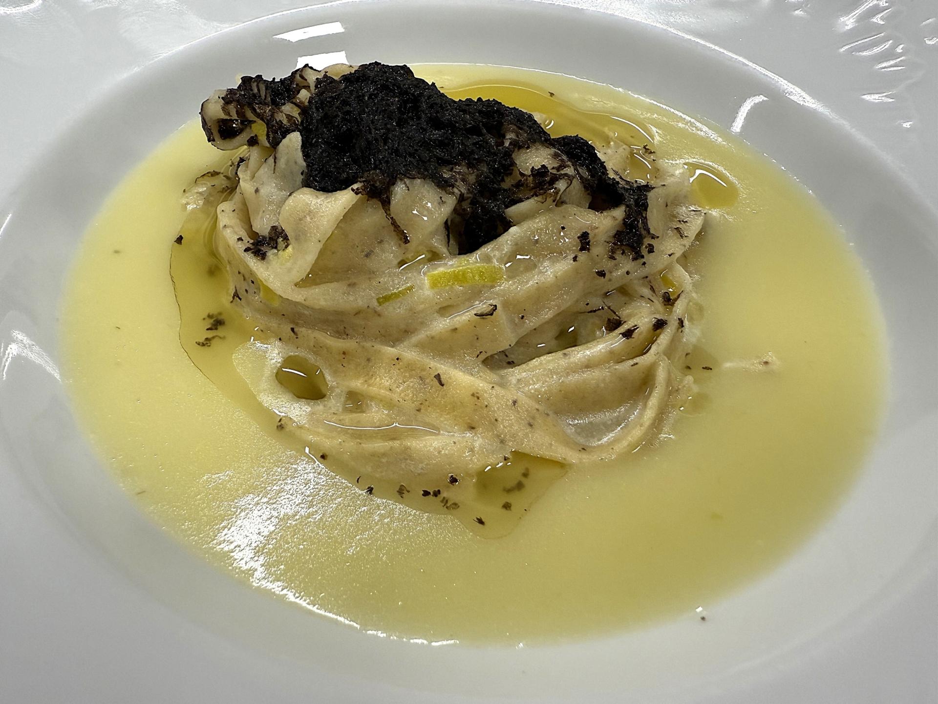 Fettuccine al grano saraceno con crema di patate e  salsa ai porri e tartufo nero