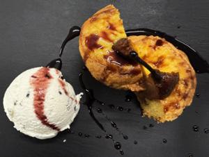disporre la crostata tiepida al centro del piatto con eventualmente una salsa alla vaniglia, disporre una pallina di gelato e servire.