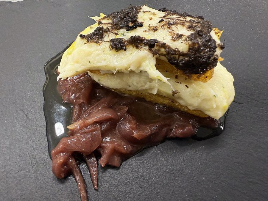 Millefoglie di polenta di mais 8 file, baccalà mantecato al tartufo nero e pane su zoccolo di cipolle brasate al dolcetto